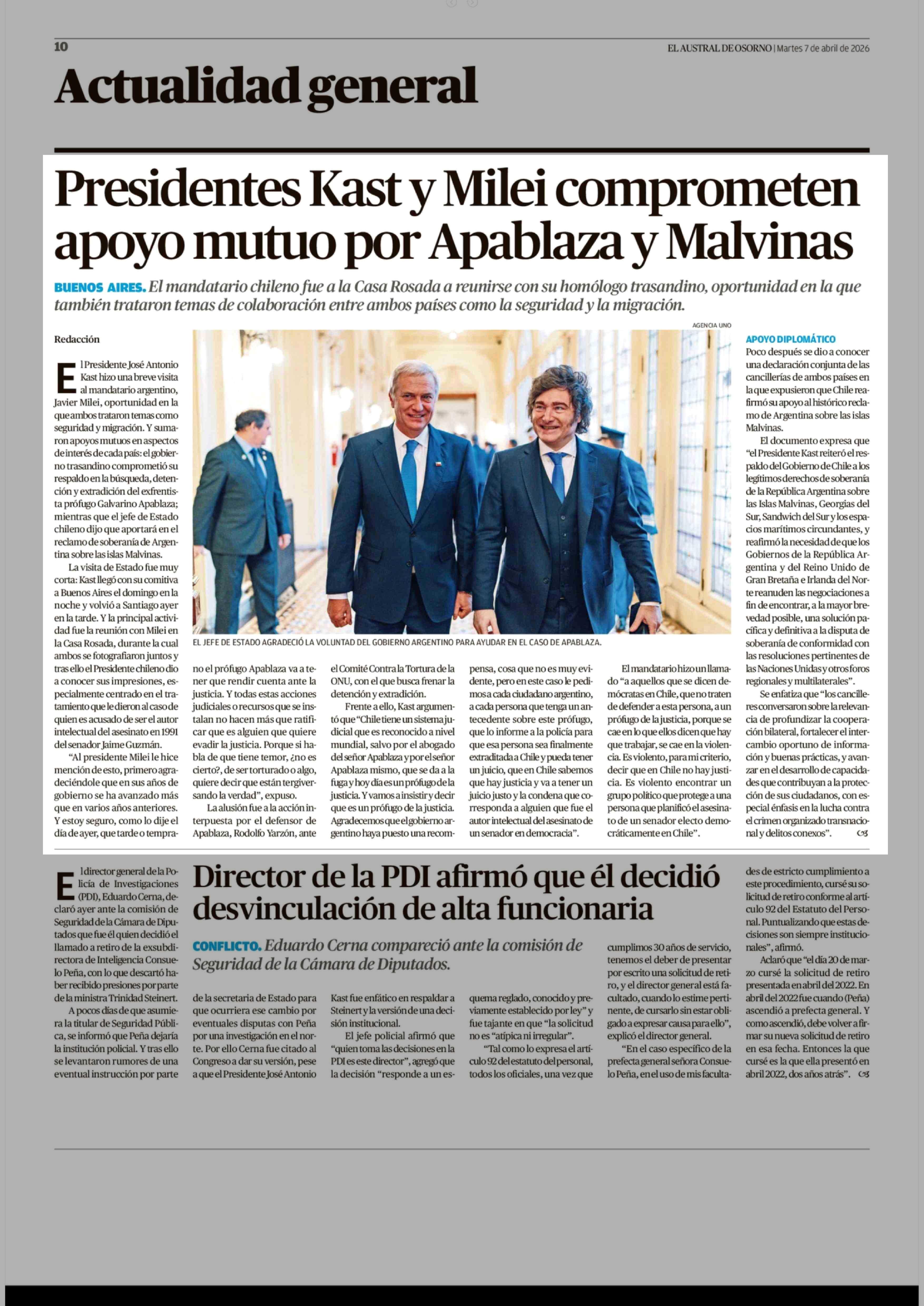 Presidentes Kast y Milei comprometen apoyo mutuo por Apablaza y Malvinas 07-04-2026 El Austral de Osorno |