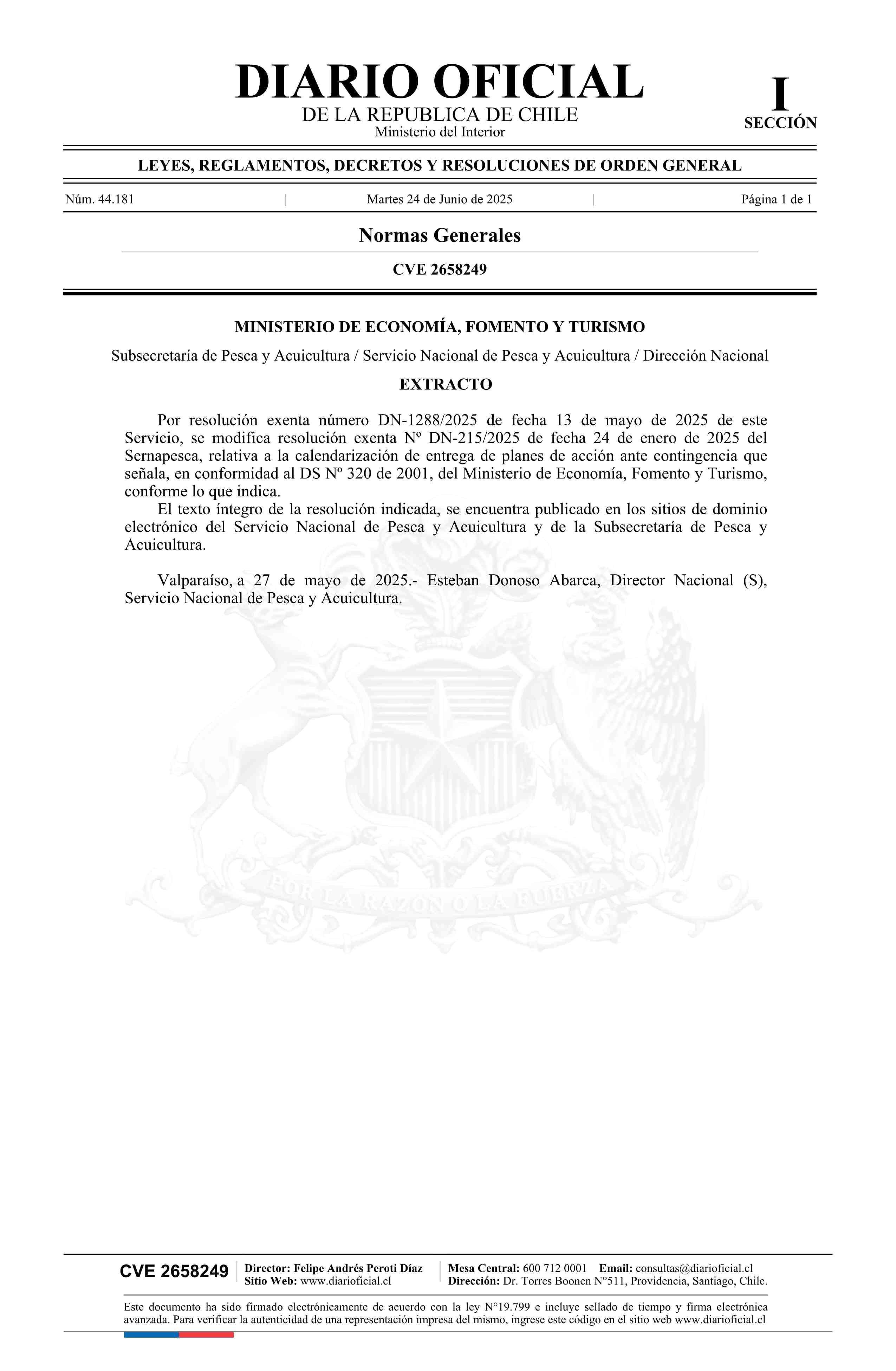 Extracto de resolución exenta número DN-1288/2025, de 2025.- Modifica resolución N° DN-215/2025 exenta, de 2025 24-06-2025 Diario Oficial Edición Electrónica |
