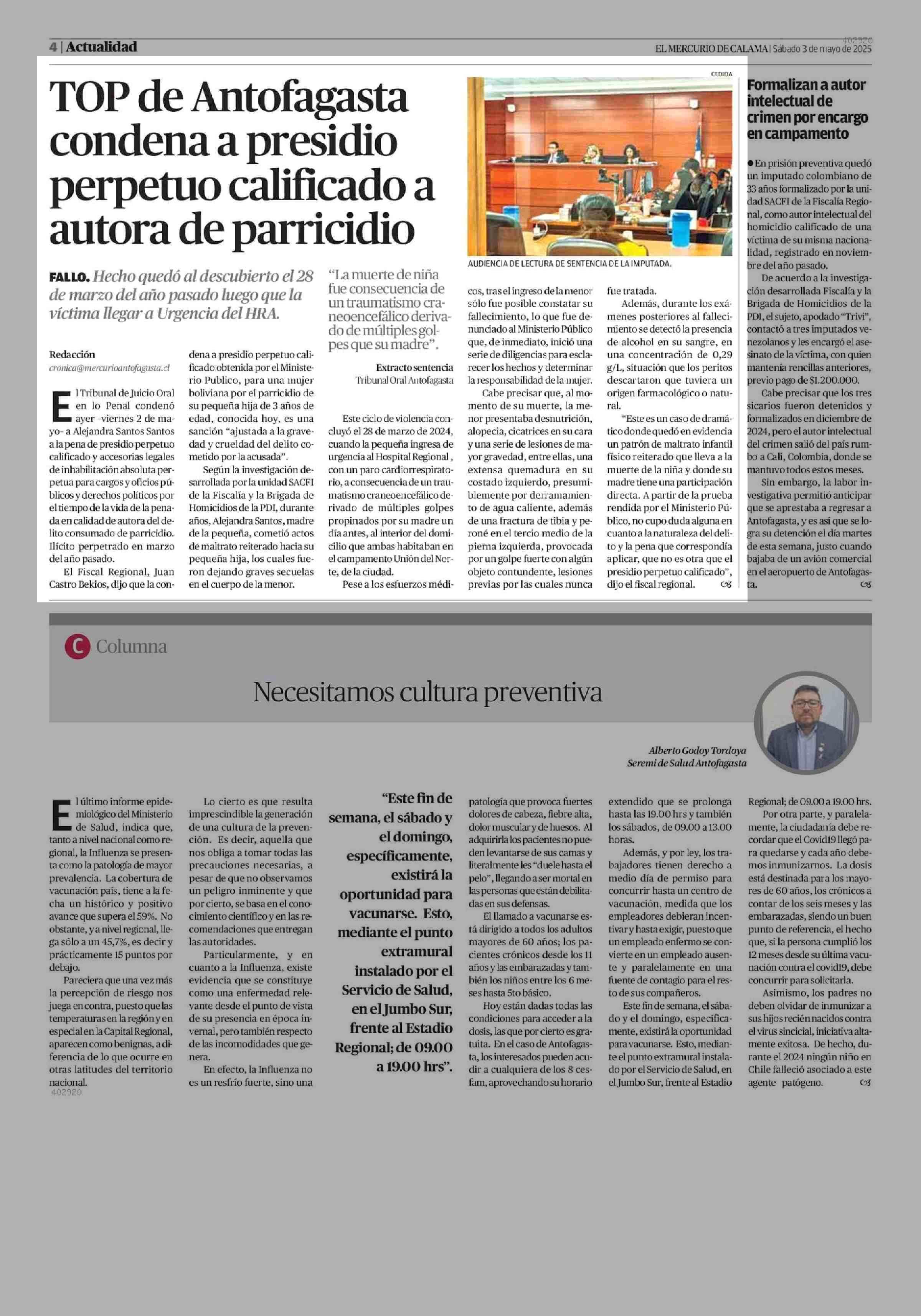 TOP de Antofagas ta condena a presidio perpetuo calificado a autora de parricidio 03-05-2025 El Mercurio de Calama |