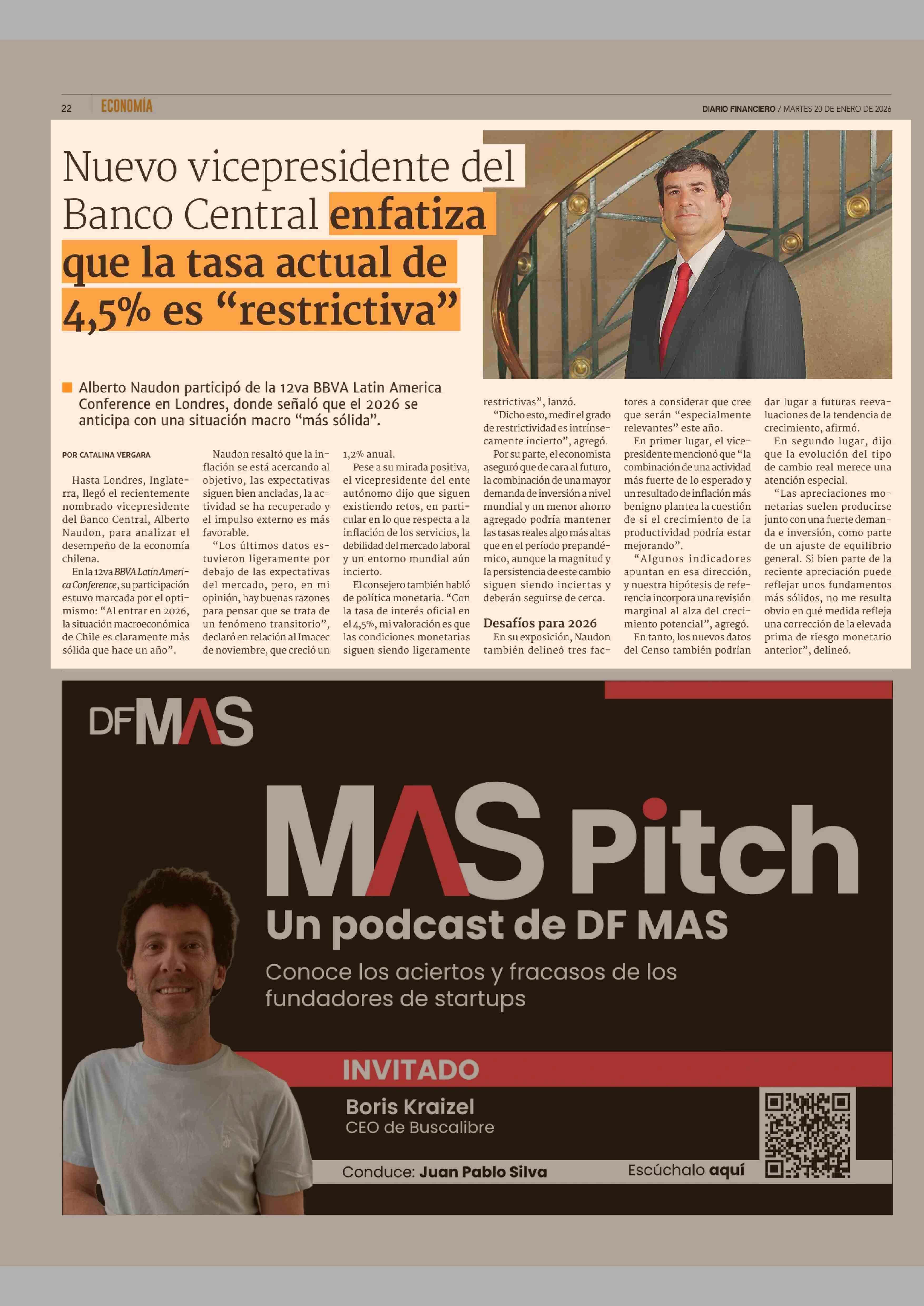 Nuevo vicepresidente del Banco Central enfatiza que la tasa actual de 4,5% es "restrictiva" 20-01-2026 Diario Financiero |