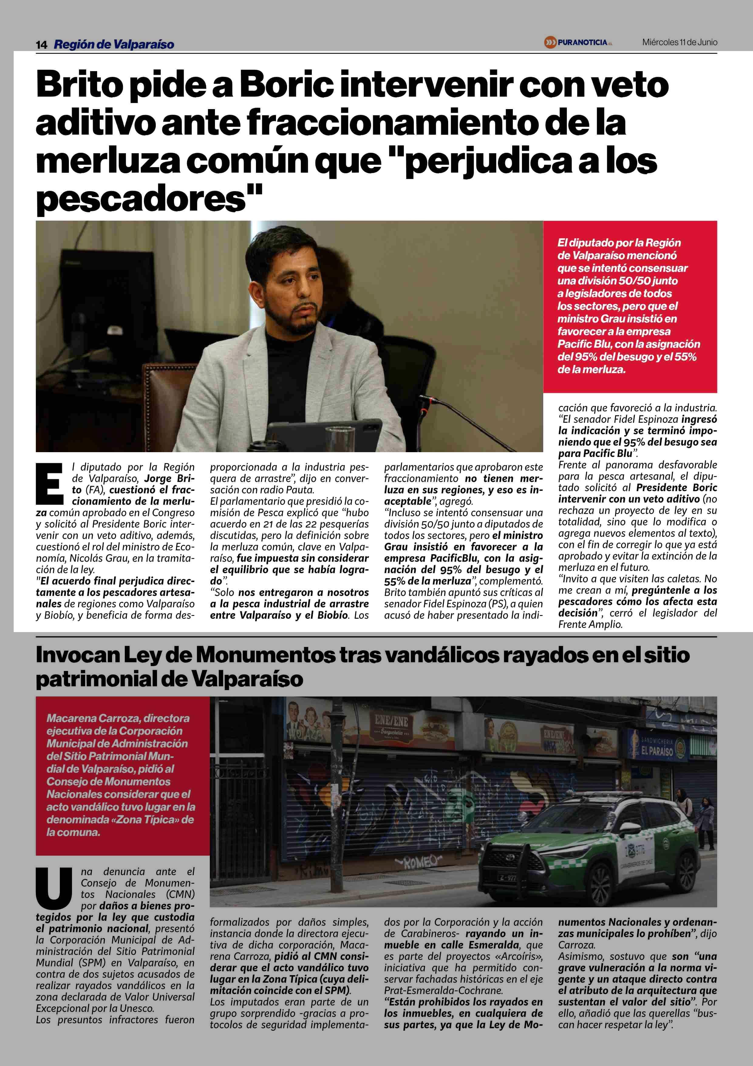 Brito pide a Boric intervenir con veto aditivo ante fraccionamiento de la merluza común que "perjudica alos pescadores” 11-06-2025 Puranoticia.cl |