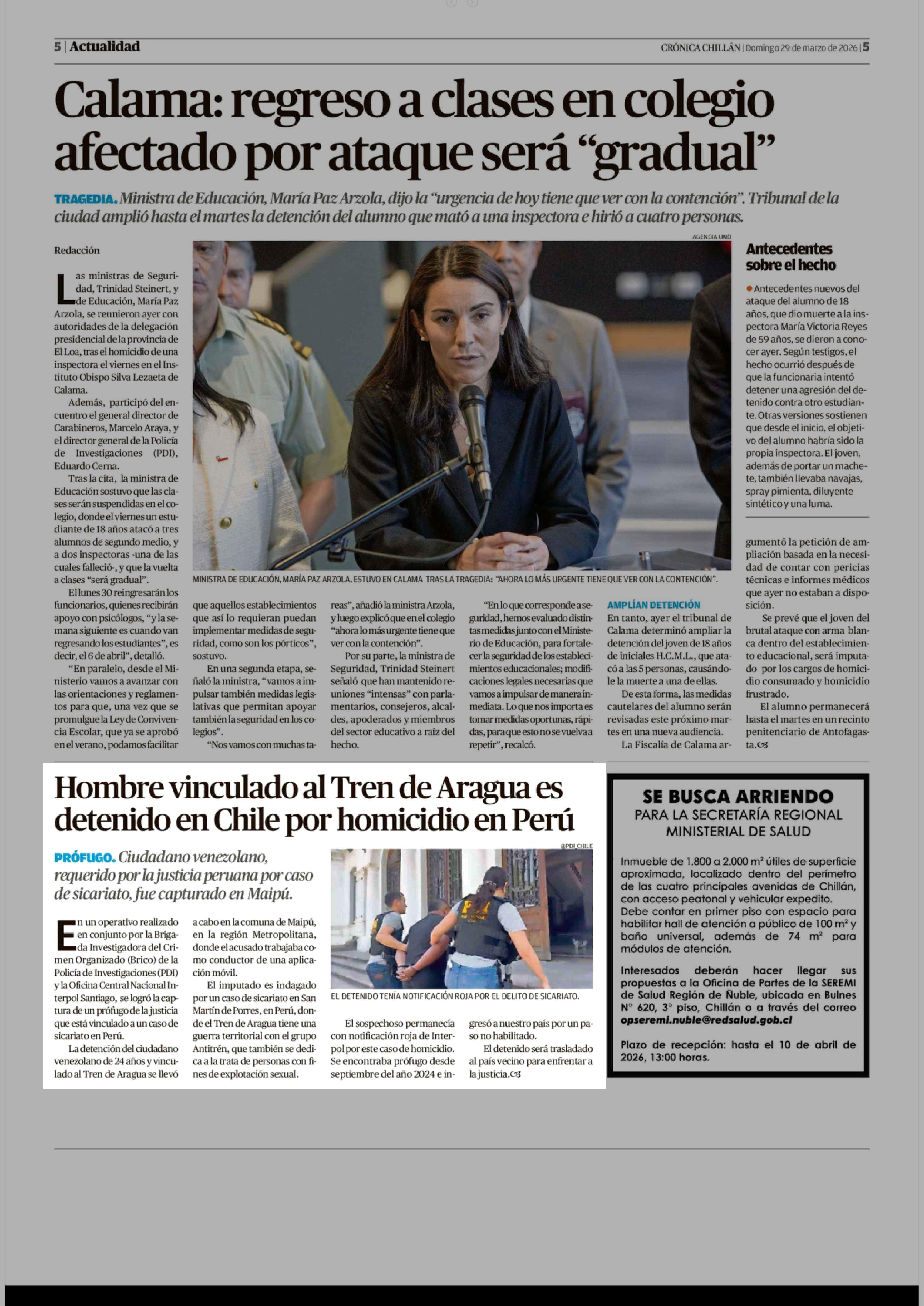 Hombre vinculado al Tren de Aragua es detenido en Chile por homicidio en Perú 29-03-2026 Crónica de Chillán |