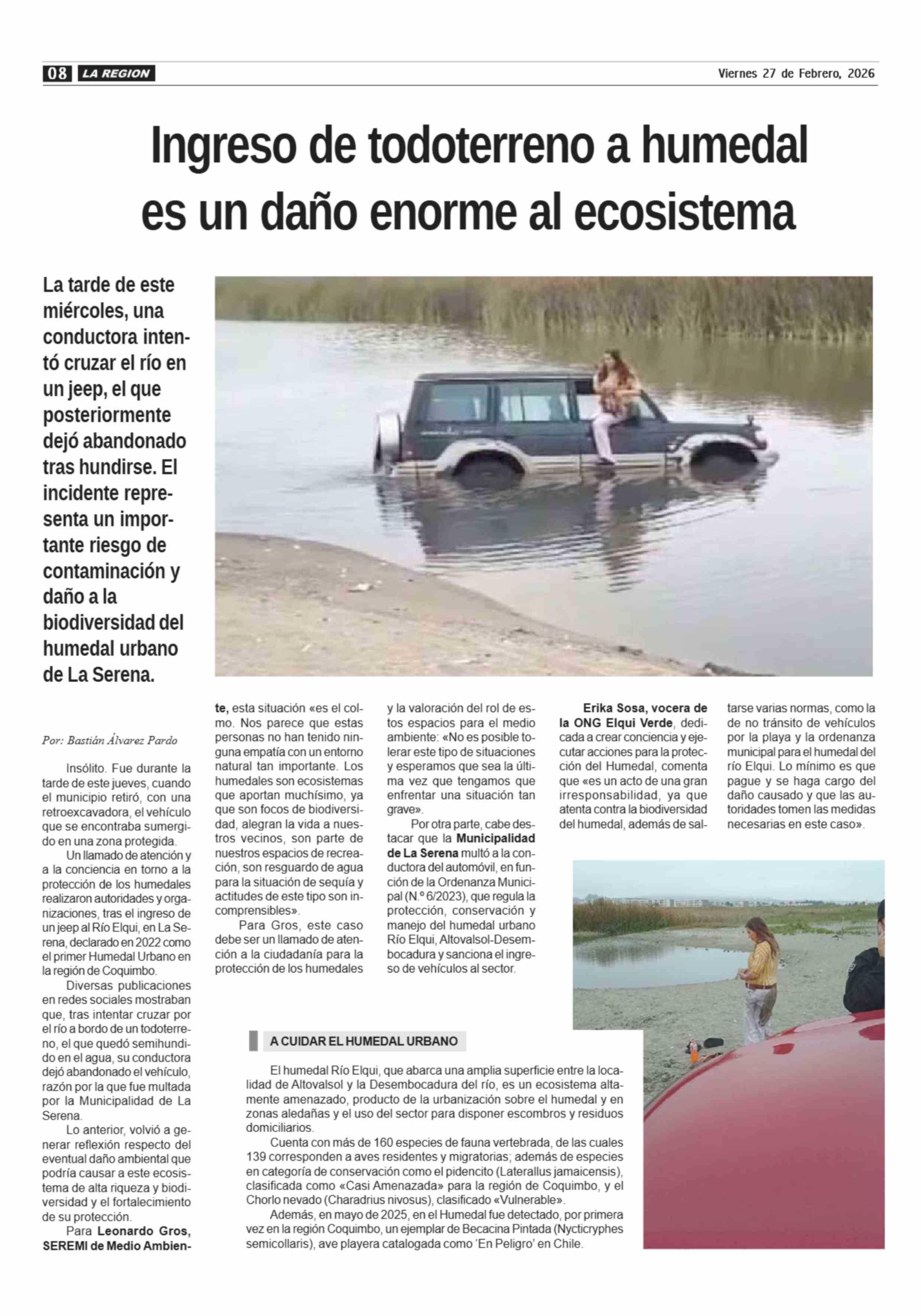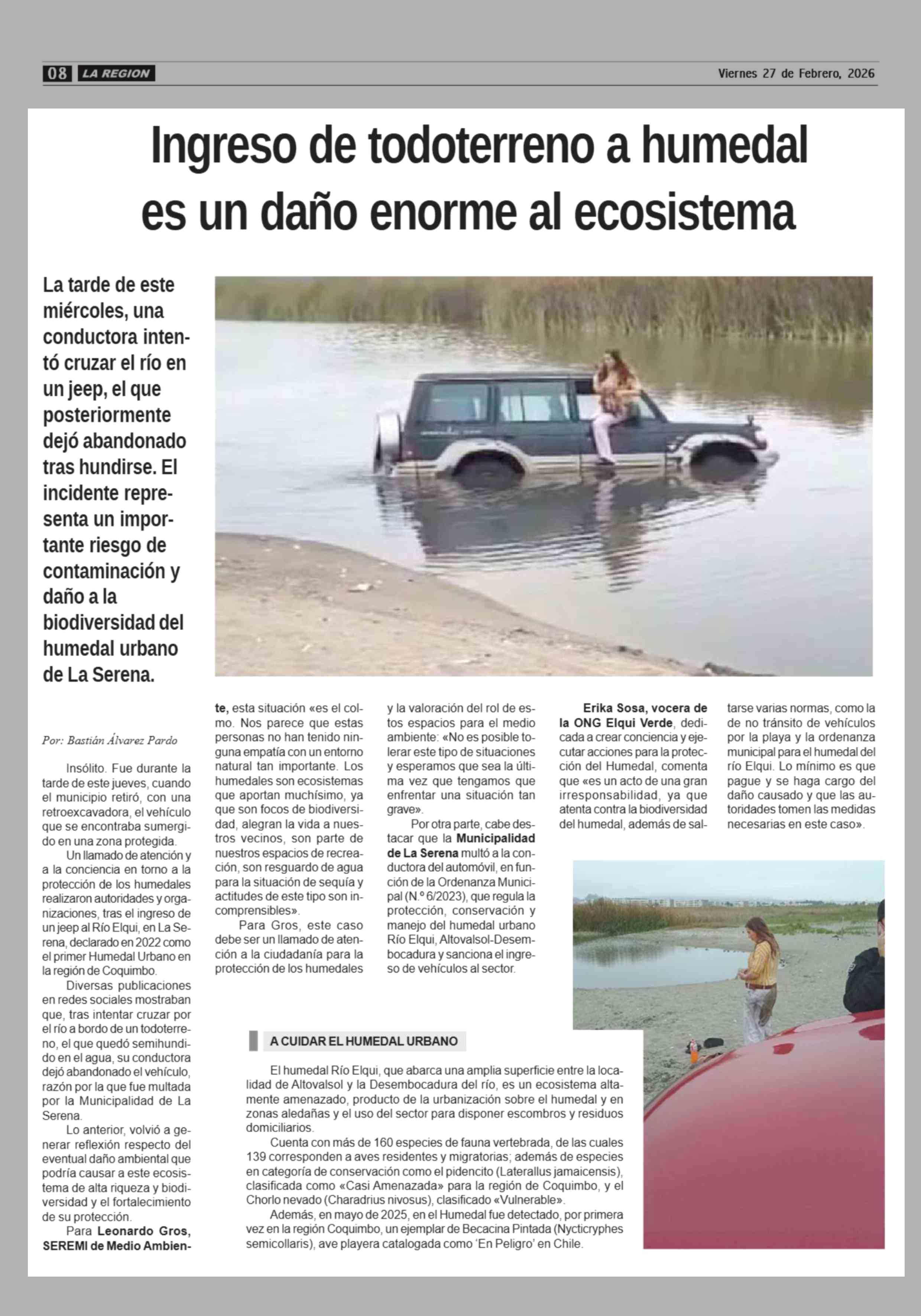 Ingreso de todoterreno a humedal es un daño enorme al ecosistema 27-02-2026 Diario la Región |