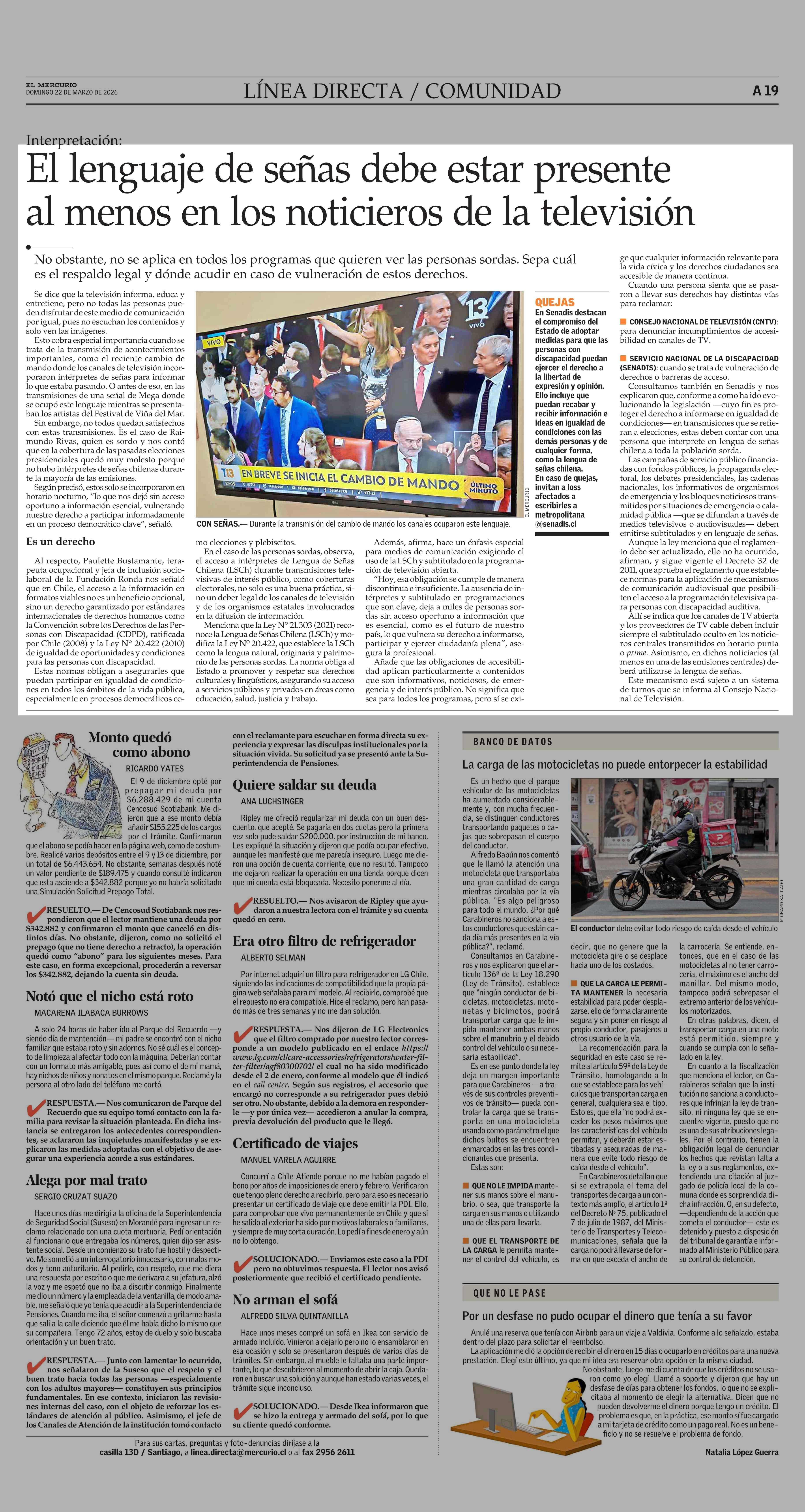 El lenguaje de señas debe estar presente al menos en los noticieros de la televisión 22-03-2026 El Mercurio |