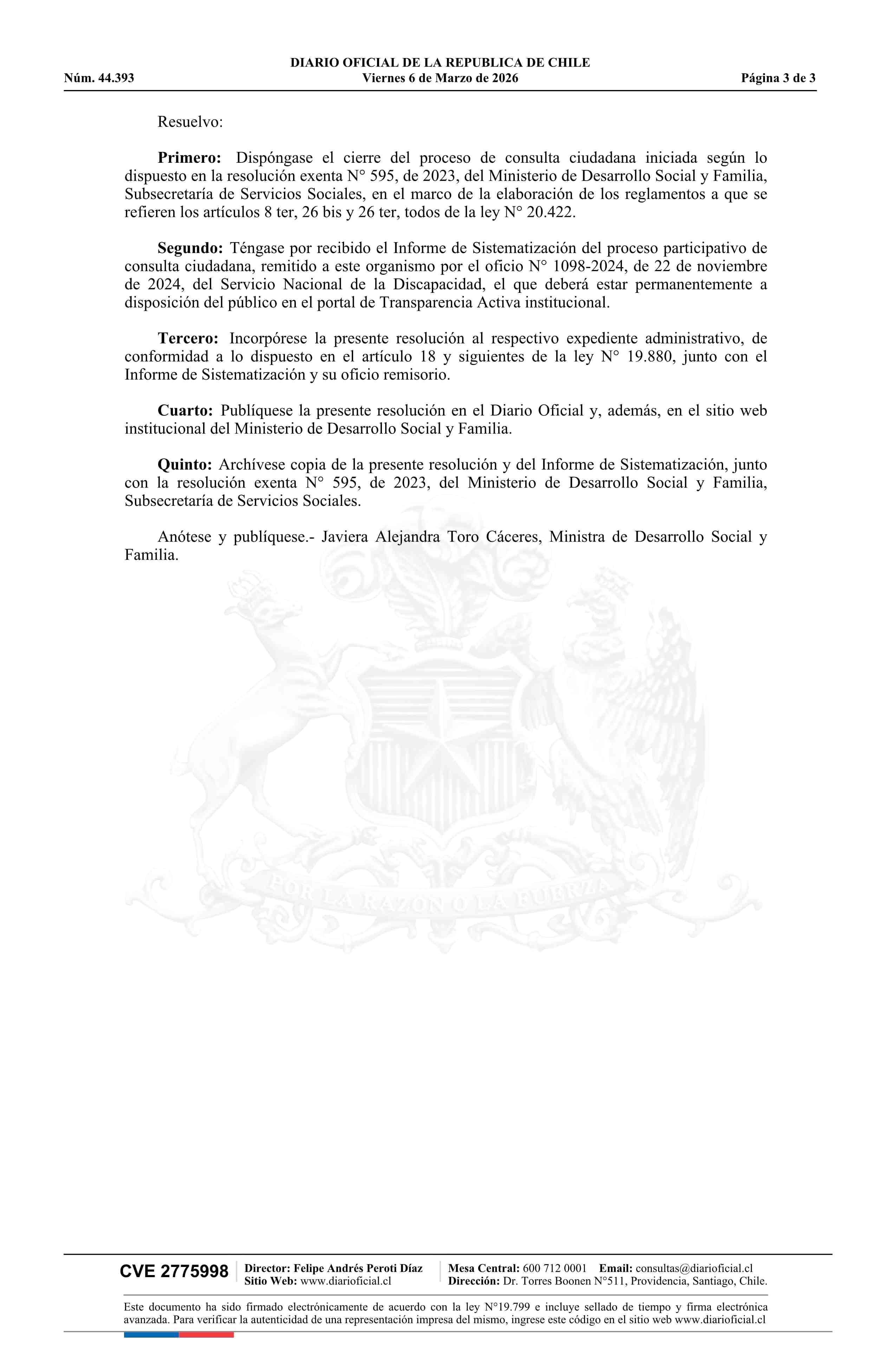 | Título: | Resolución exenta número 135, de 2026.- Dispone el cierre del proceso de consulta ciudadana iniciada según lo dispuesto en la resolución N° 595 exenta, de 2023 |