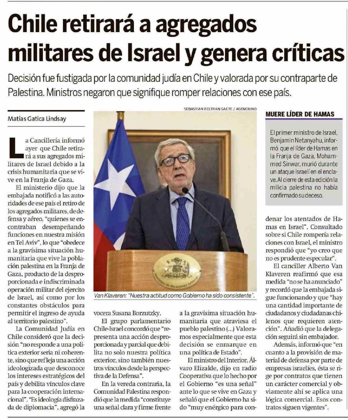 | Título: | Chile retirará a agregados militares de Israel y genera críticas |