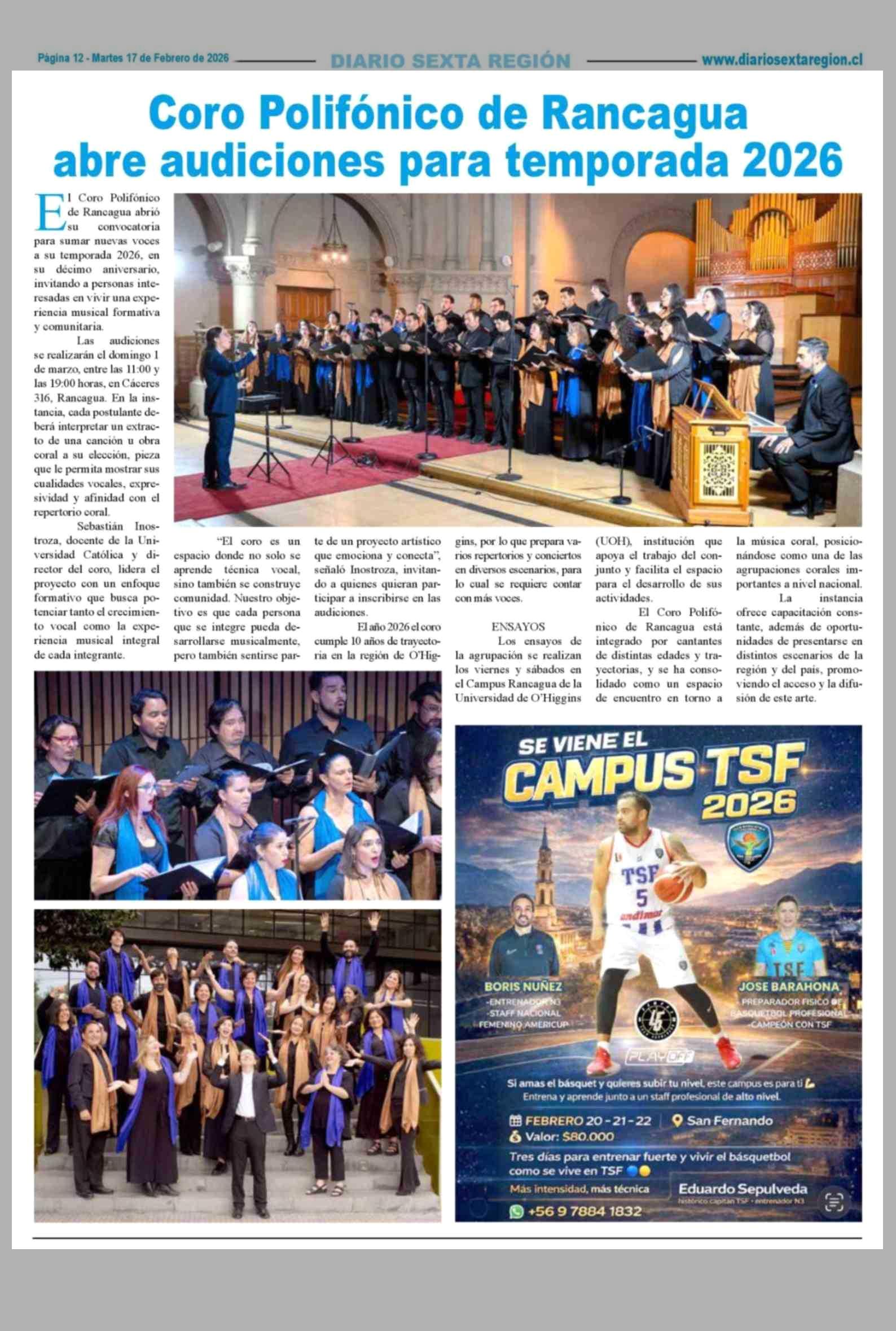 Coro Polifónico de Rancagua abre audiciones para temporada 2026 17-02-2026 Diario VI Región |