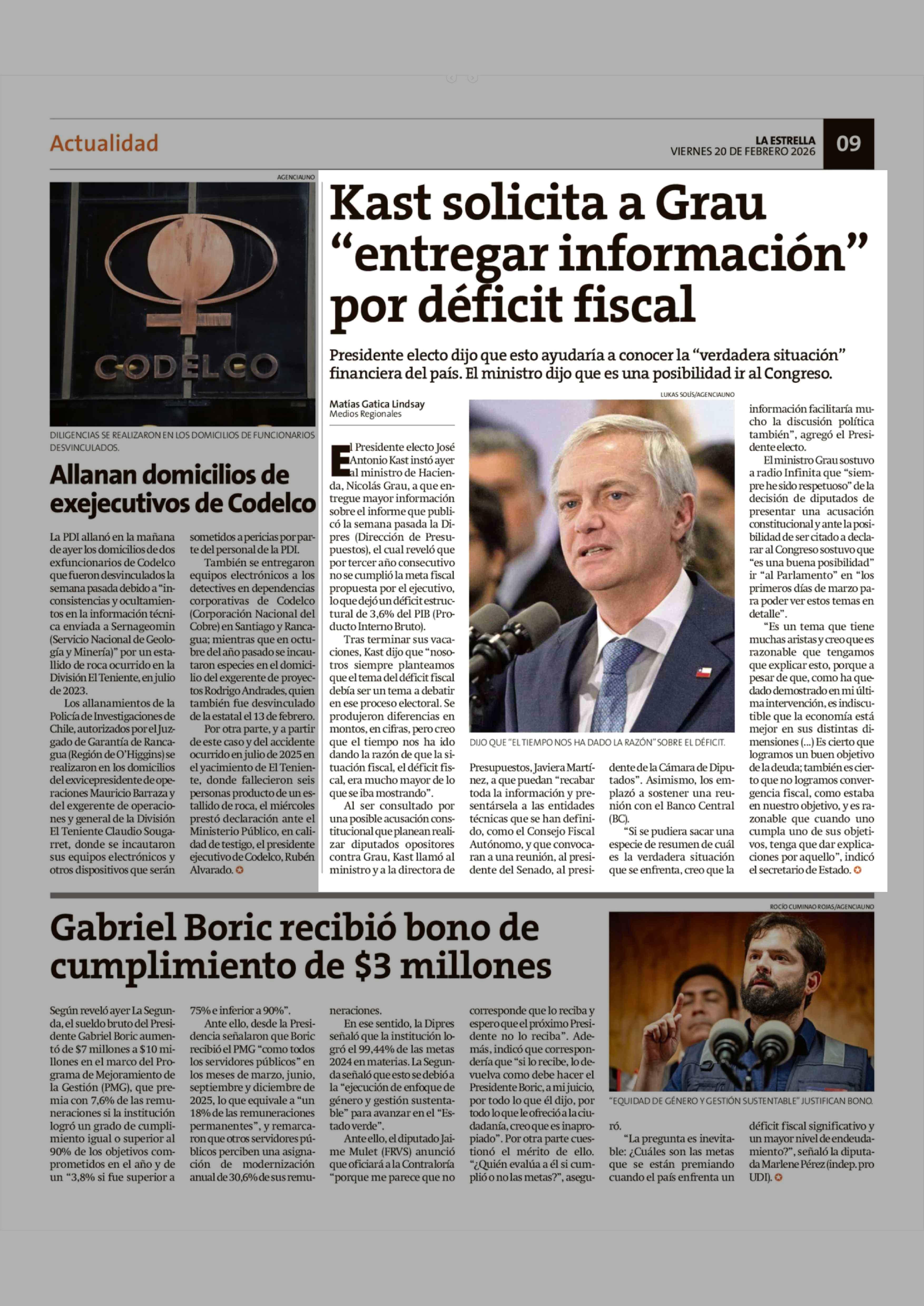 Kast solicita a Grau "entregar información" por déficit fiscal 20-02-2026 La Estrella de Chiloé |