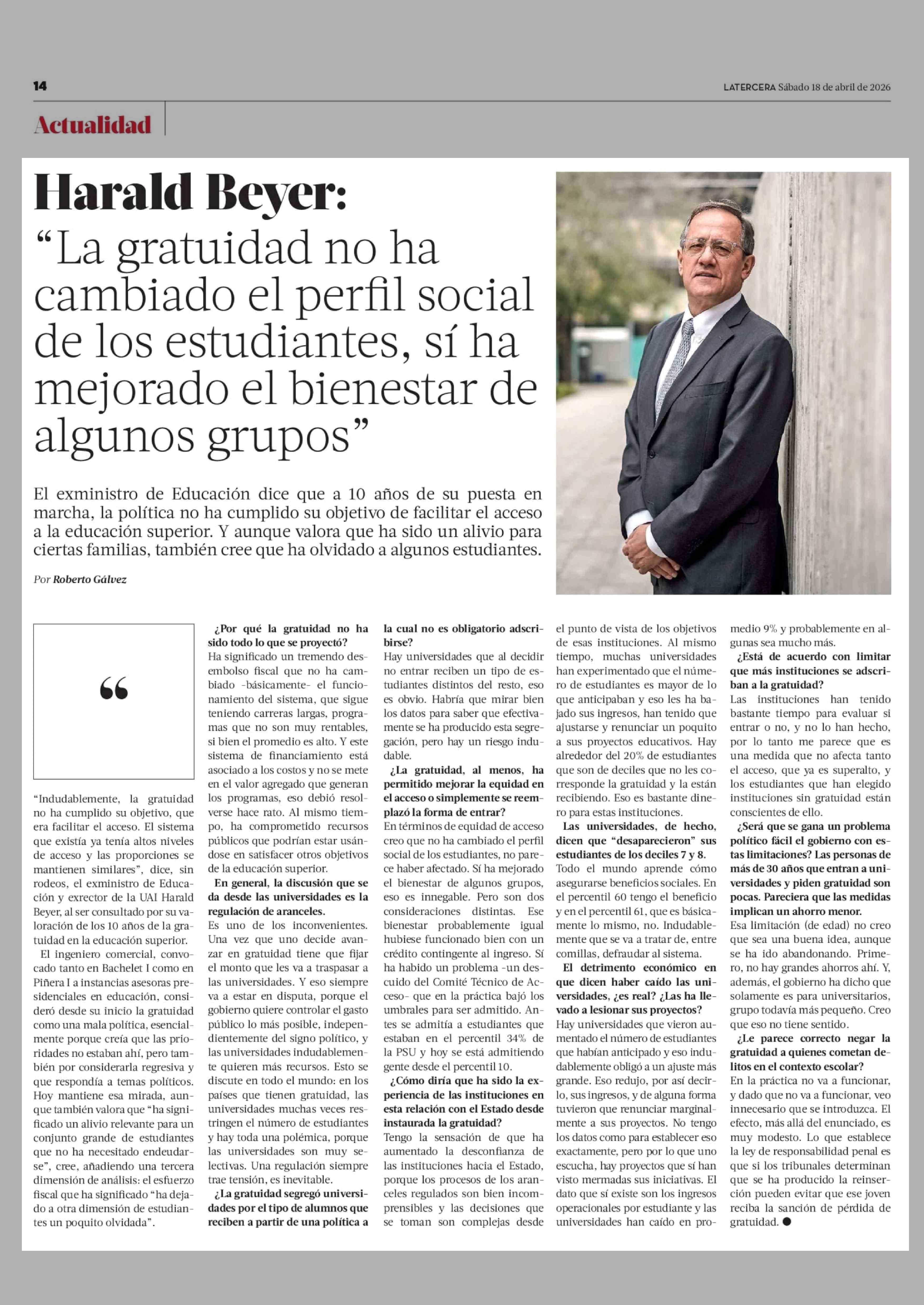 Harald Beyer: "La gratuidad no ha cambiado el perfil social de los estudiantes, sí ha mejorado el bienestar de algunos grupos" 18-04-2026 La Tercera |