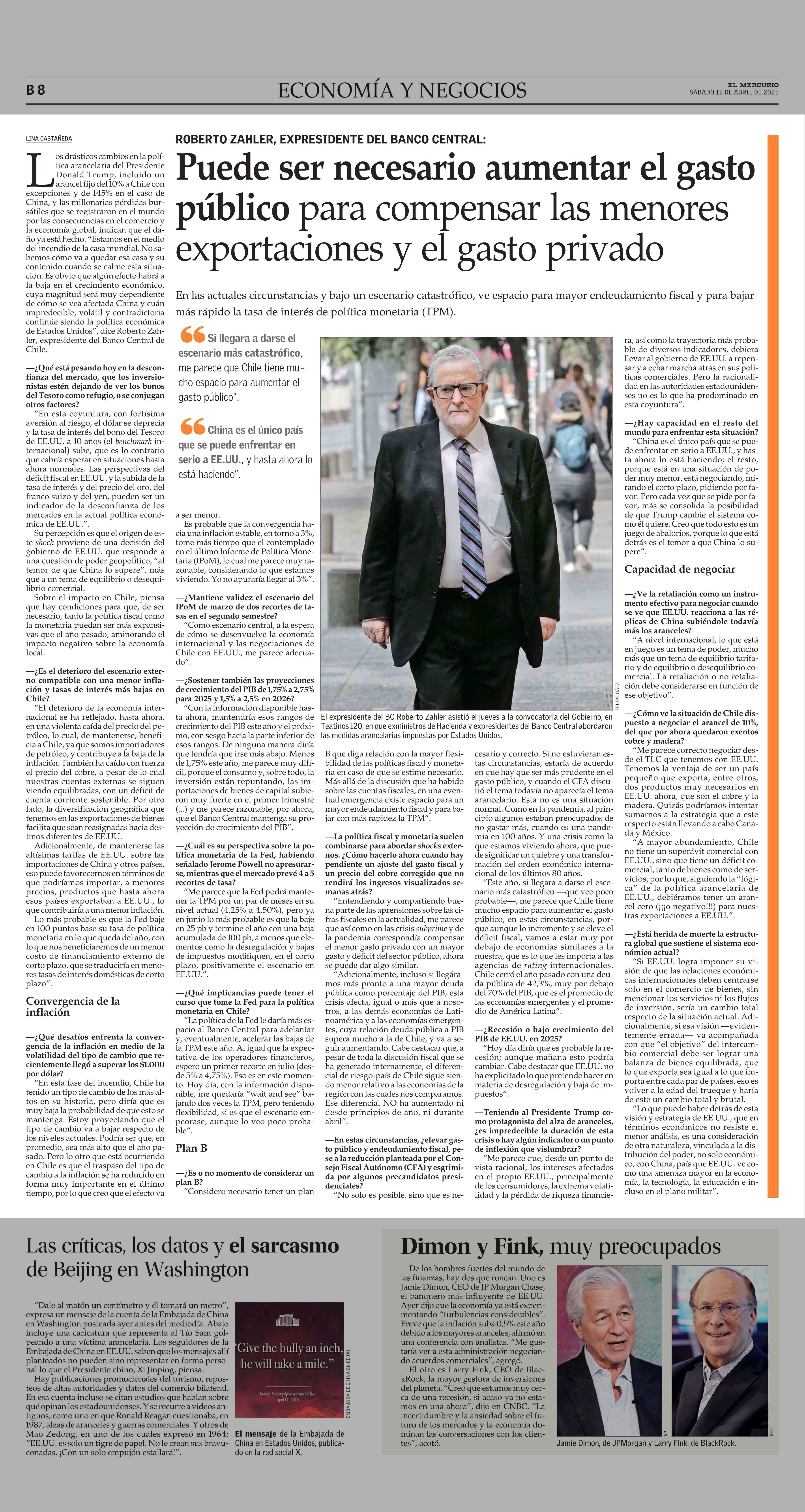 Puede ser necesario aumentar el gasto público para compensar las menores exportaciones y el gasto privado 12-04-2025 El Mercurio |