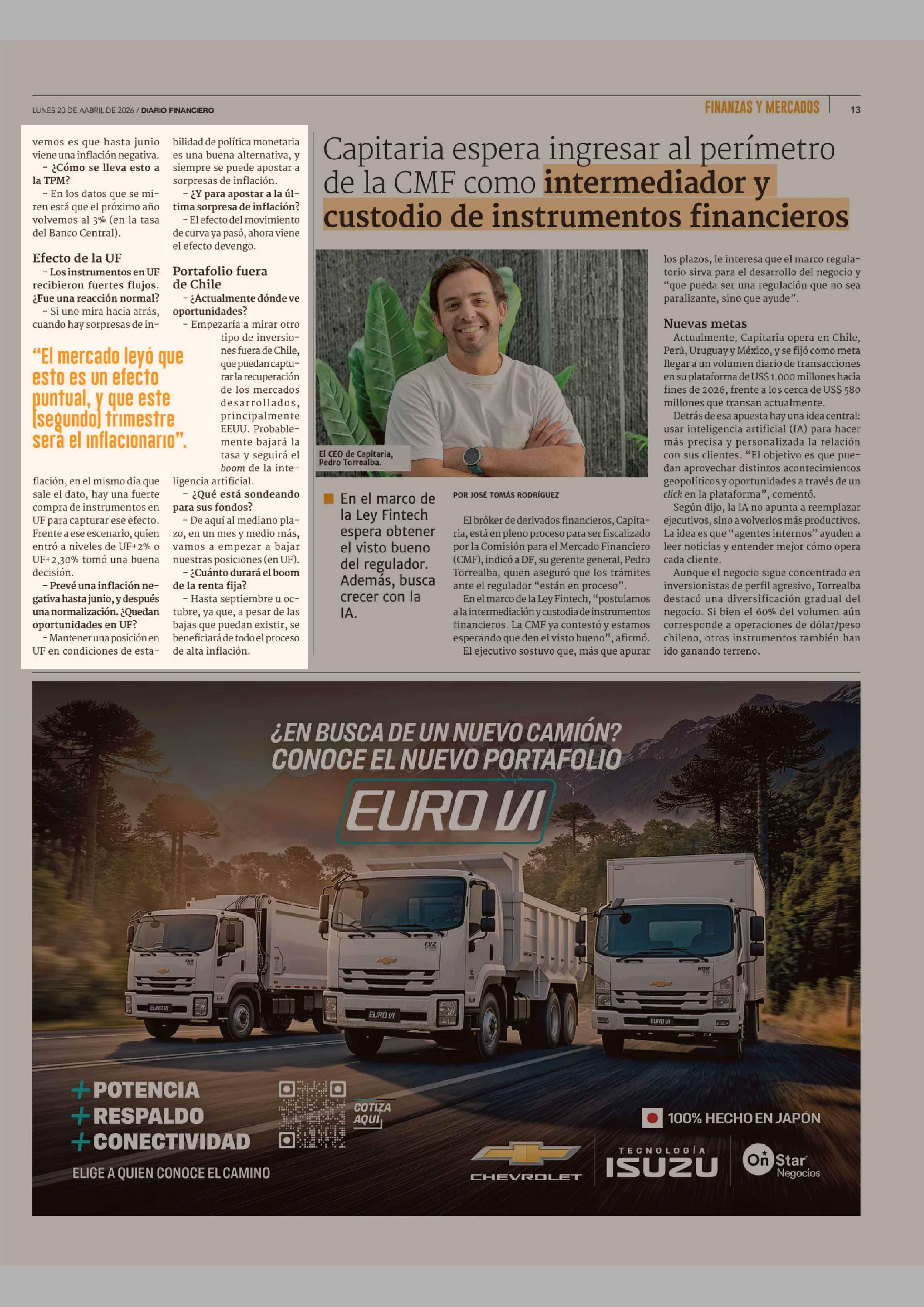 "Mantener posiciones en UF con estabilidad de política monetaria es una buena alternativa" 20-04-2026 Diario Financiero |