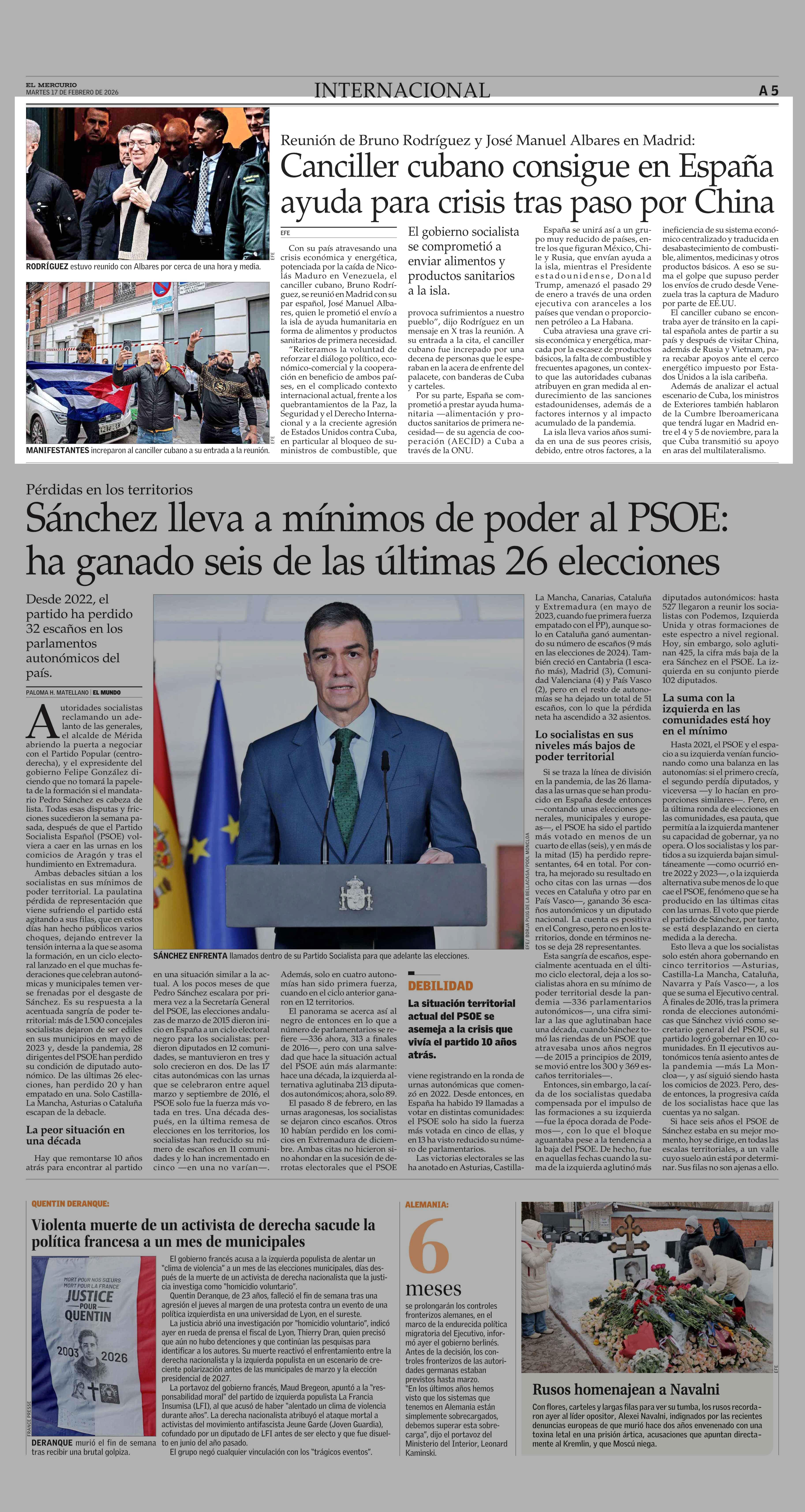 Canciller cubano consigue en España ayuda para crisis tras paso por China 17-02-2026 El Mercurio |