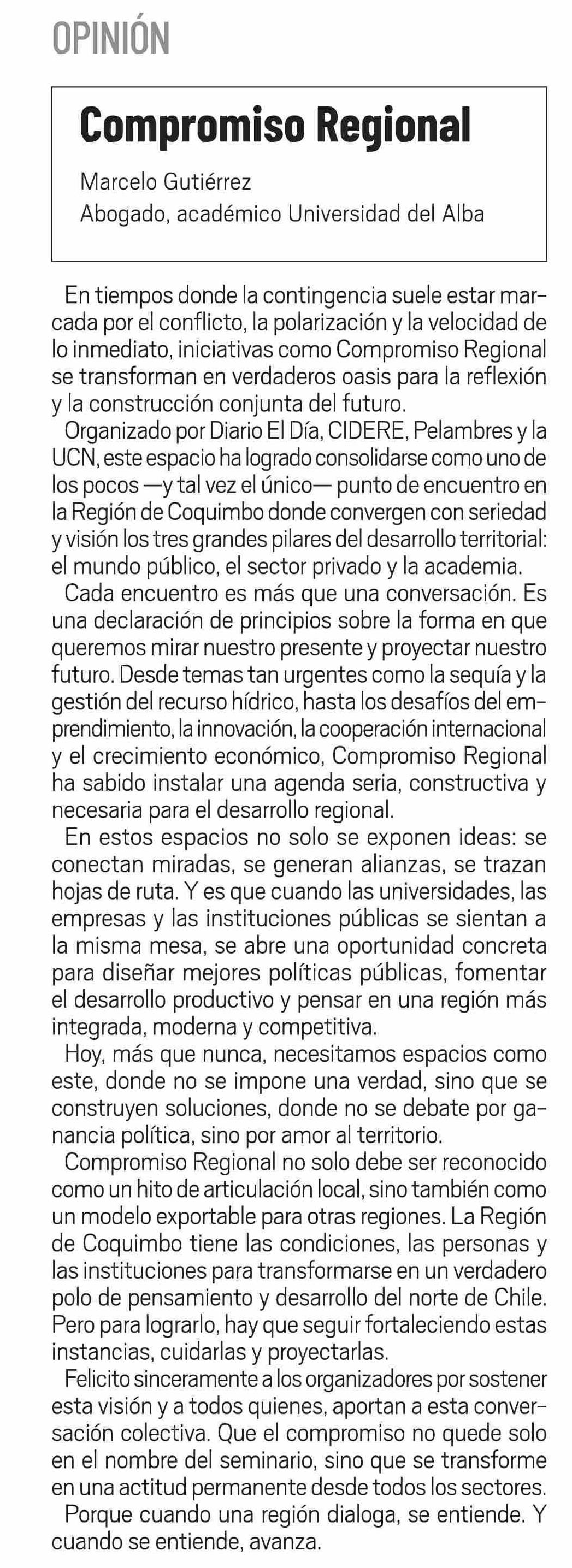 COLUMNAS DE OPINIÓN: Compromiso Regional 05-06-2025 El Día |