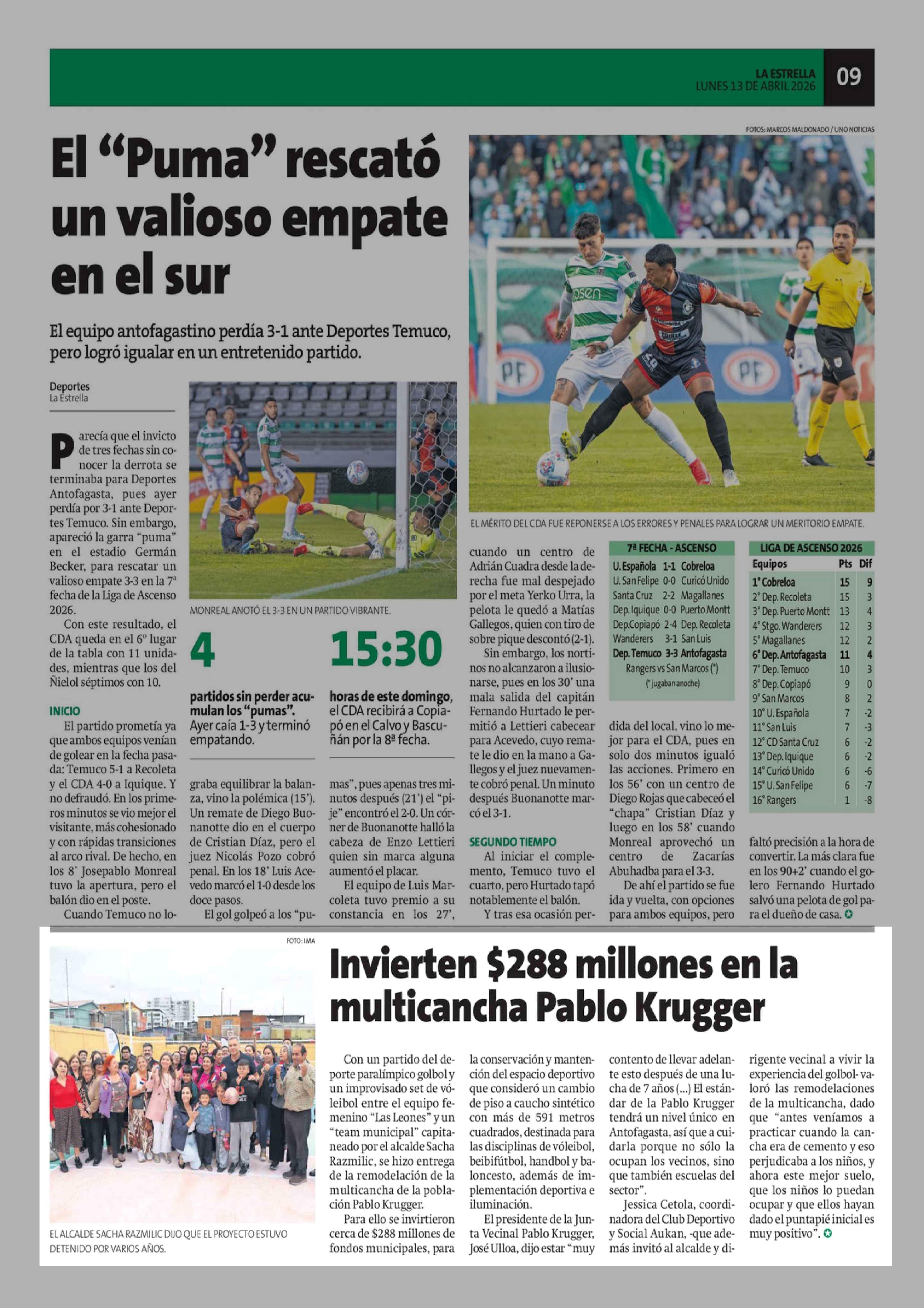 Invierten $288 millones en la multicancha Pablo Krugger 13-04-2026 La Estrella de Antofagasta |