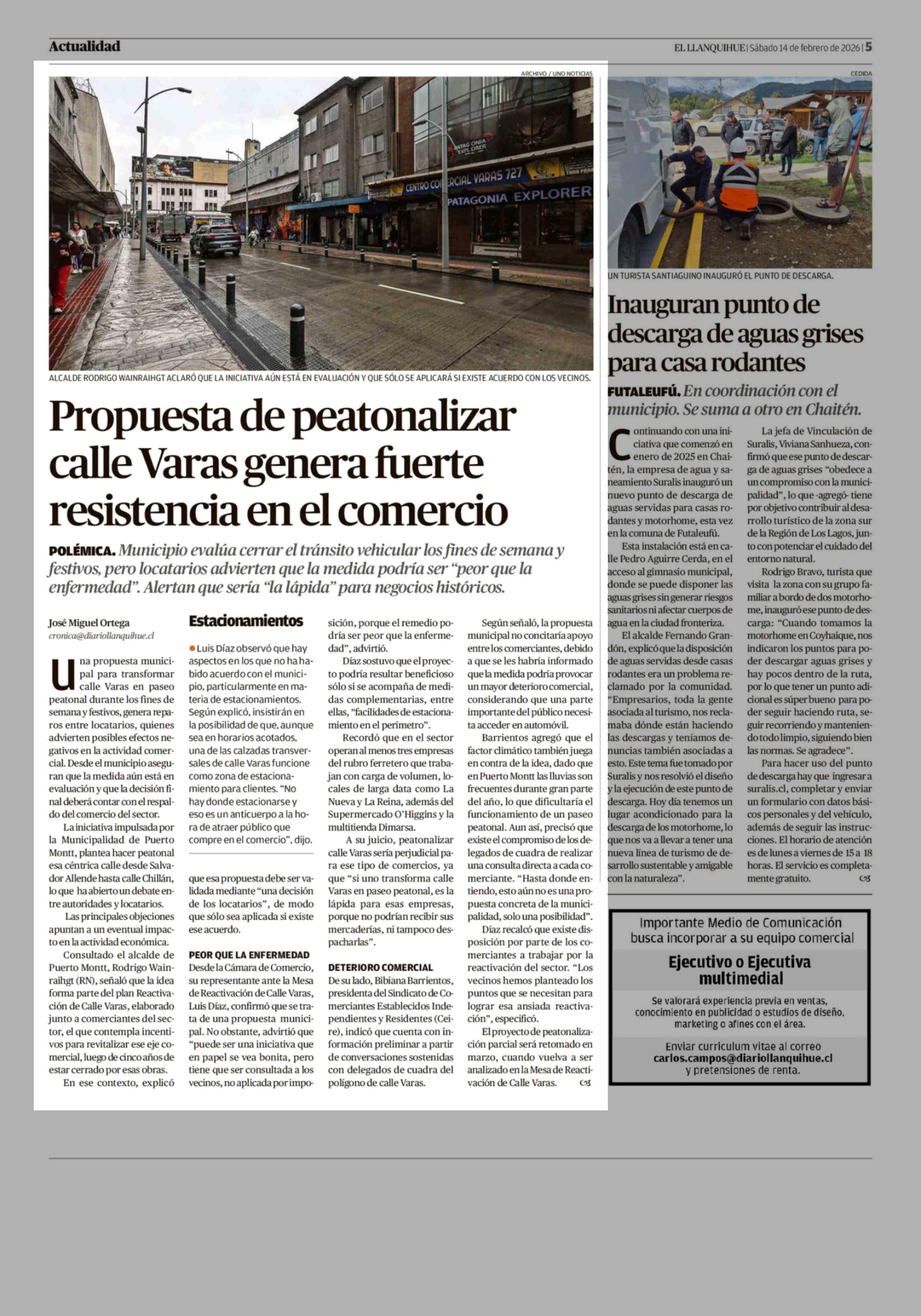 Propuesta de peatonalizar calle Varas genera fuerte resistencia en el comercio 14-02-2026 El Llanquihue |