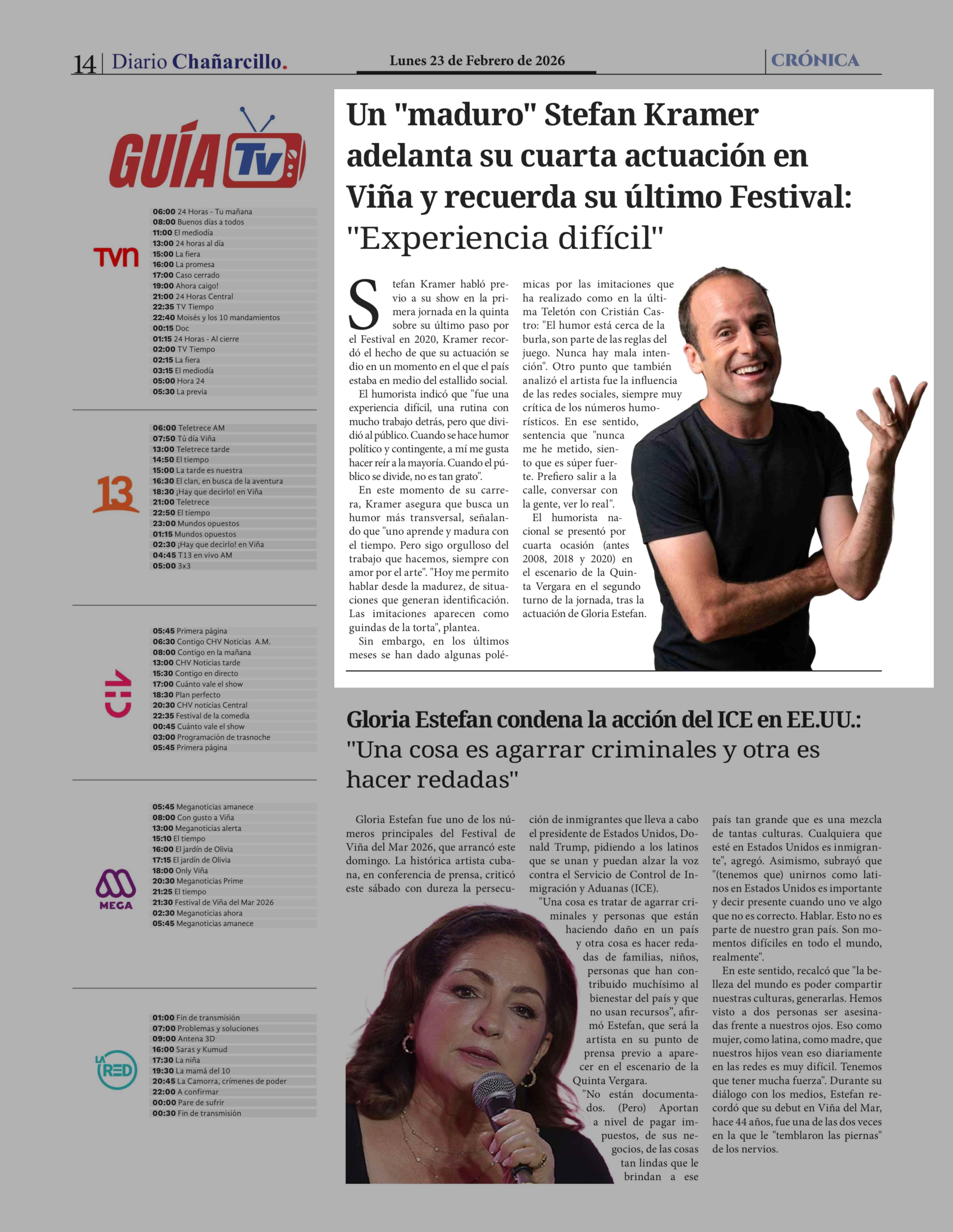 Un "maduro" Stefan Kramer adelanta su cuarta actuación en Viña y recuerda su último Festival: "Experiencia difícil" 23-02-2026 Diario Chañarcillo |