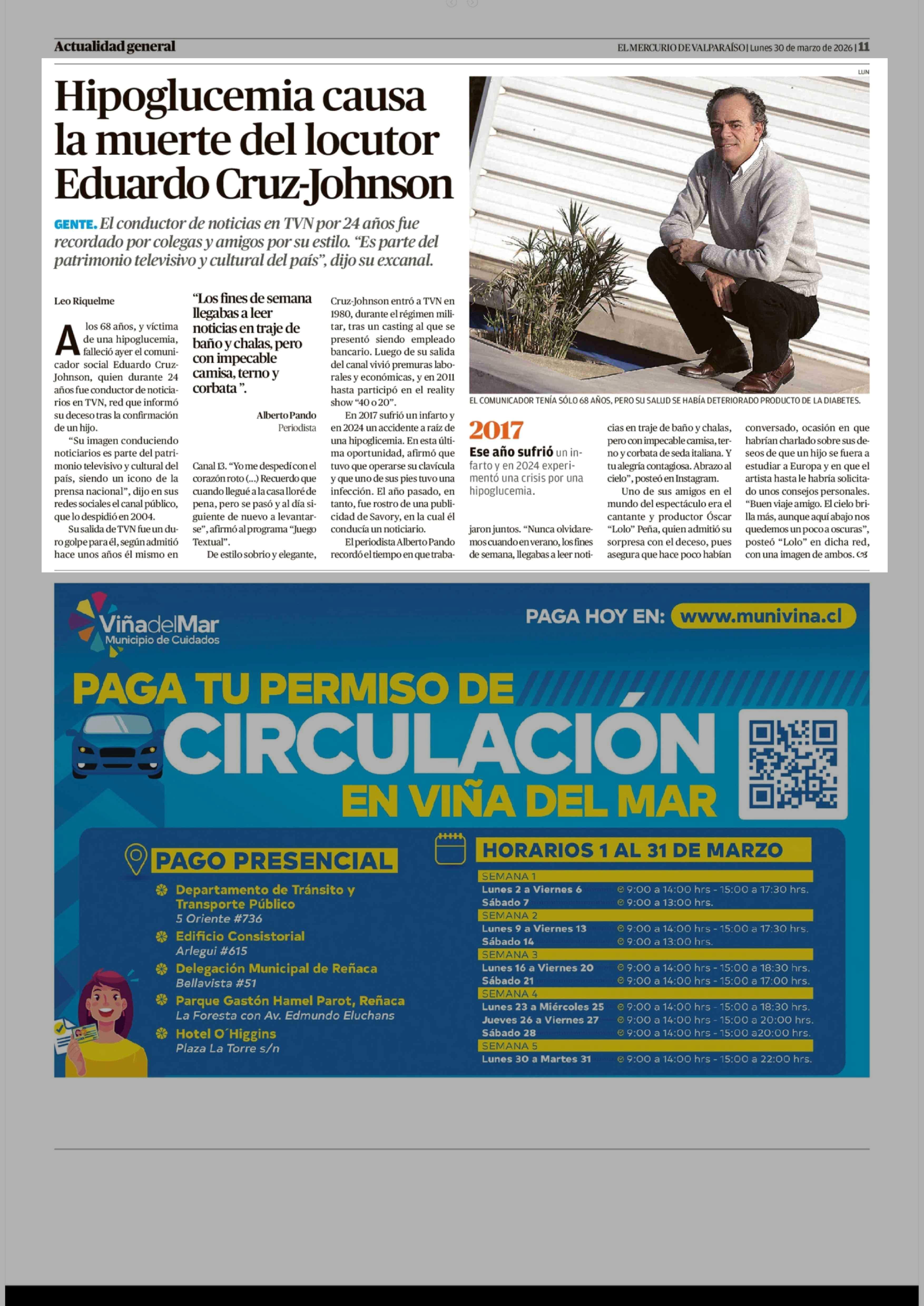 Hipoglucemia causa la muerte del locutor Eduardo Cruz-Johnson 30-03-2026 El Mercurio de Valparaíso |