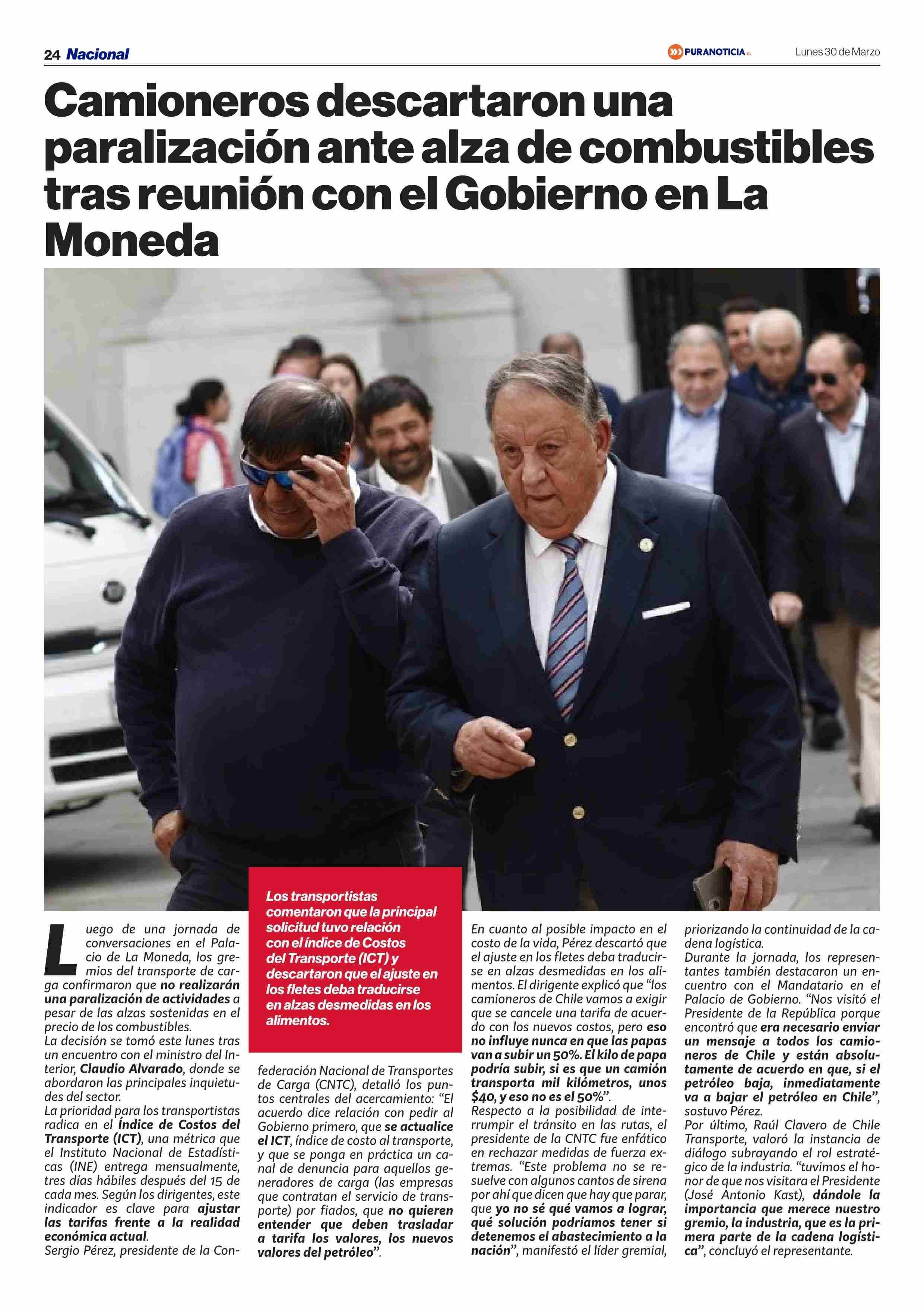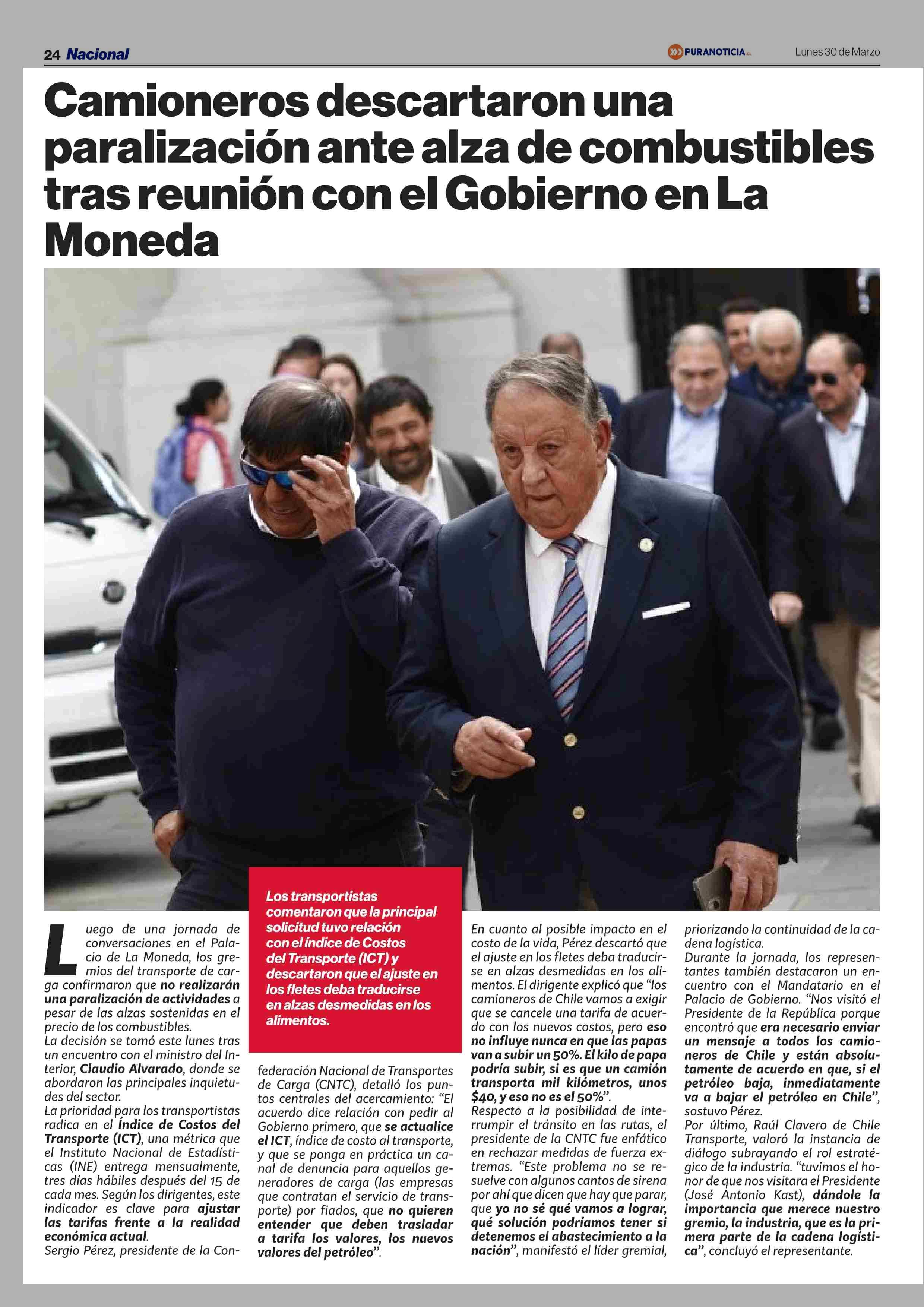 Camioneros descartaron una paralización ante alza de combustibles tras reunión con el Gobierno en La Moneda 30-03-2026 Puranoticia.cl |