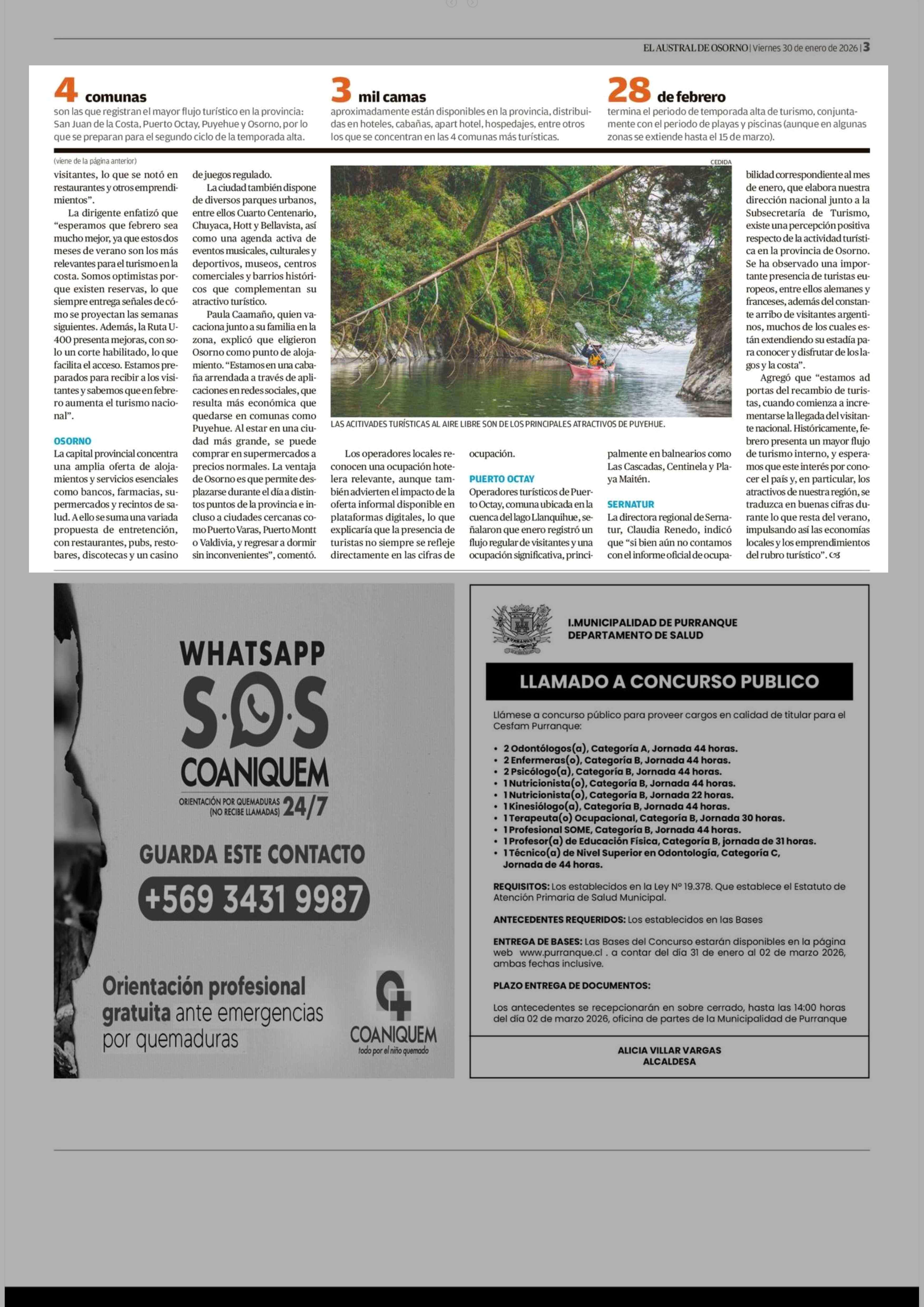 Alta afluencia de turistas marca el mes de enero en la provincia 30-01-2026 El Austral de Osorno |