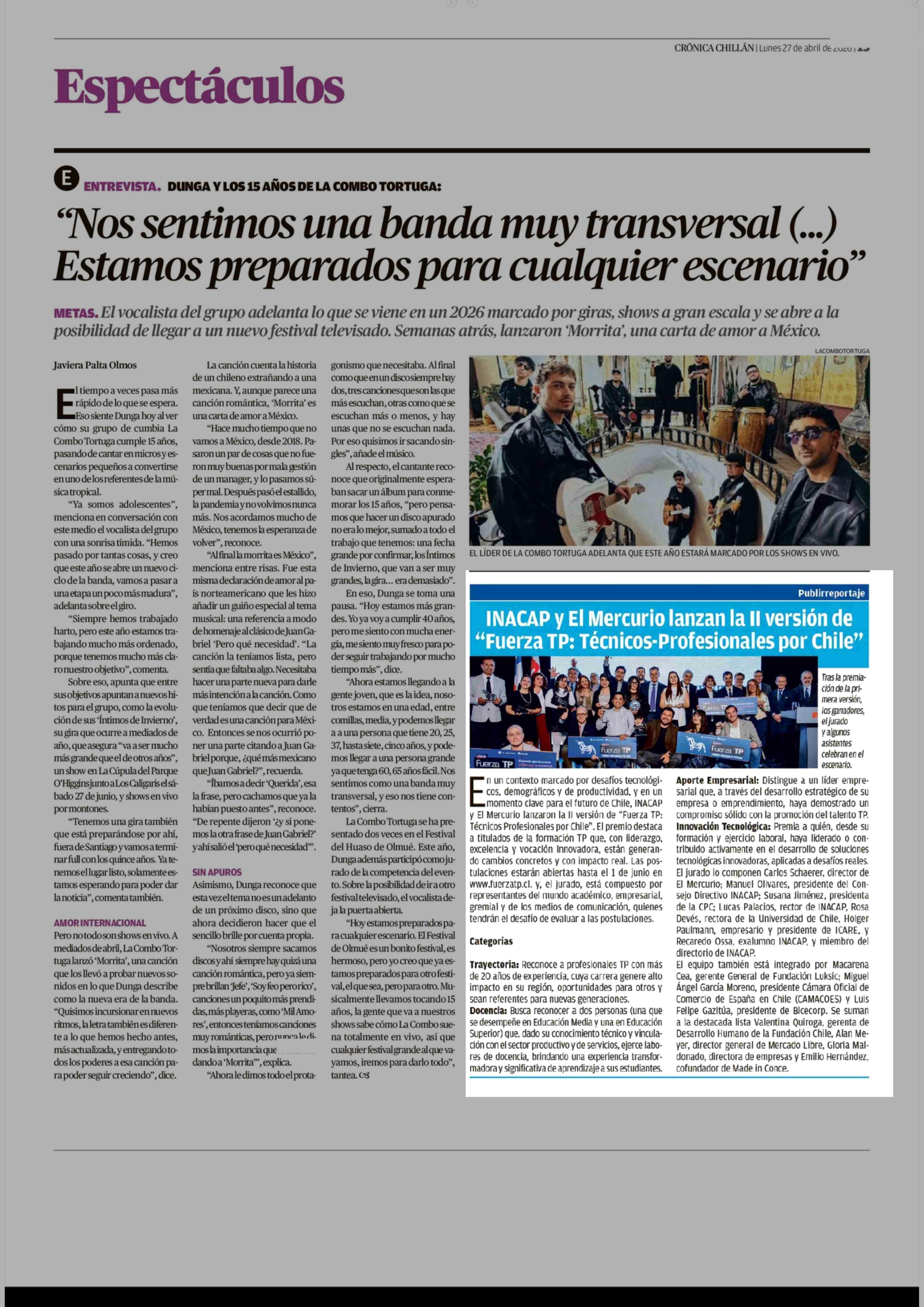 INACAP y El Mercurio lanzan la 11 versión de “Fuerza TP: Técnicos-Profesionales por Chile” 27-04-2026 Crónica de Chillán |