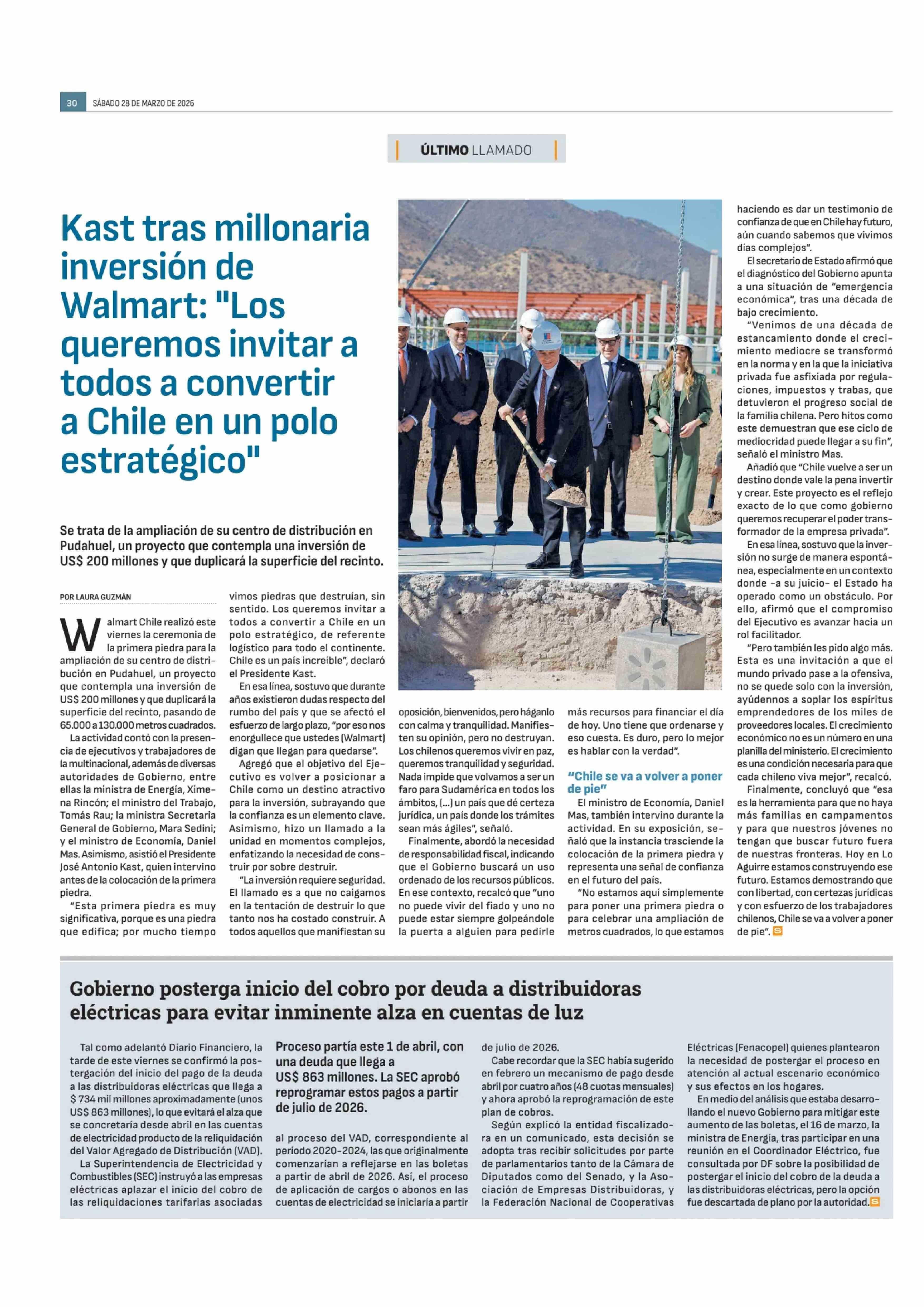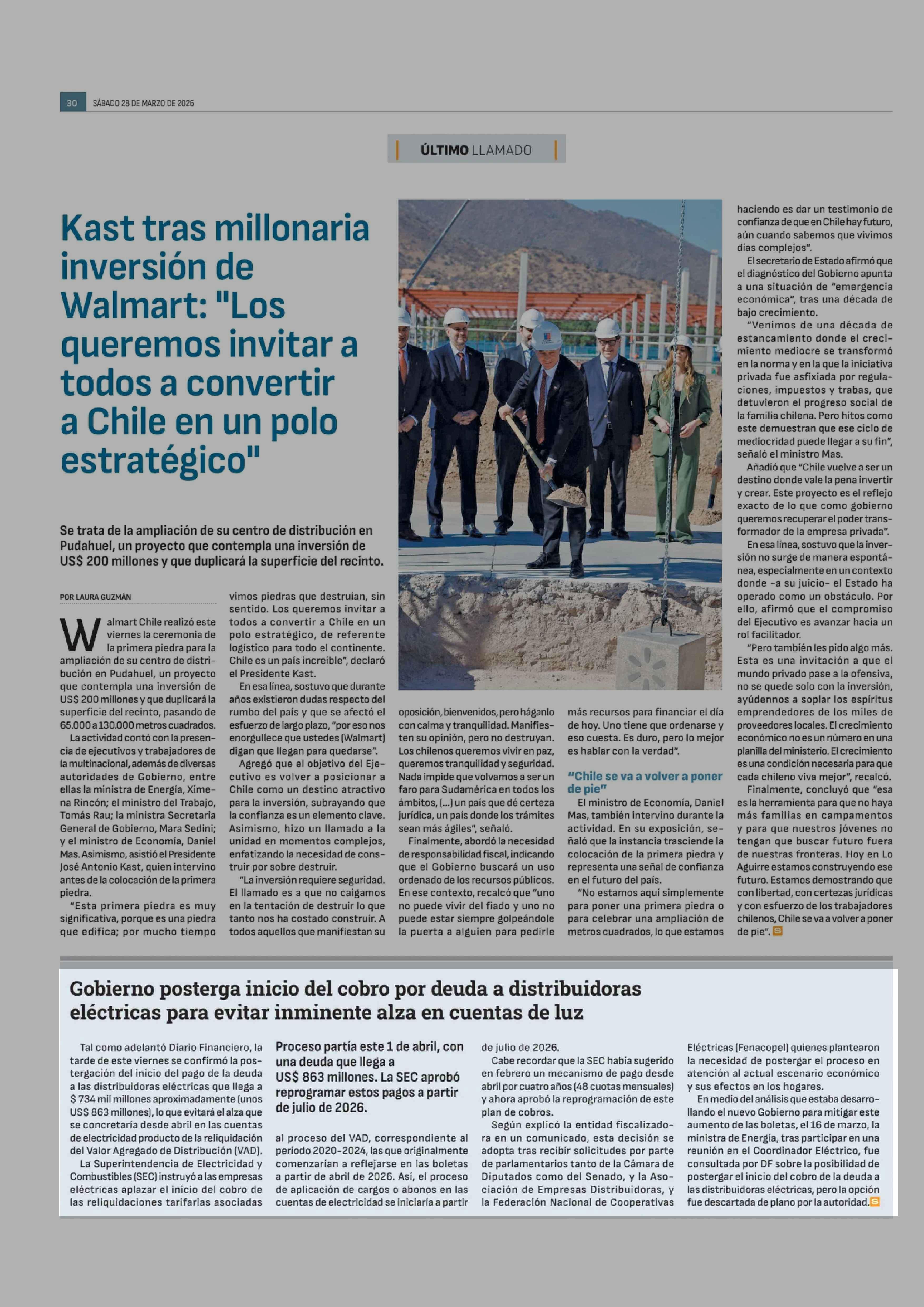 Gobierno posterga inicio del cobro por deuda a distribuidoras eléctricas para evitar inminente alza en cuentas de luz 28-03-2026 Diario Financiero |