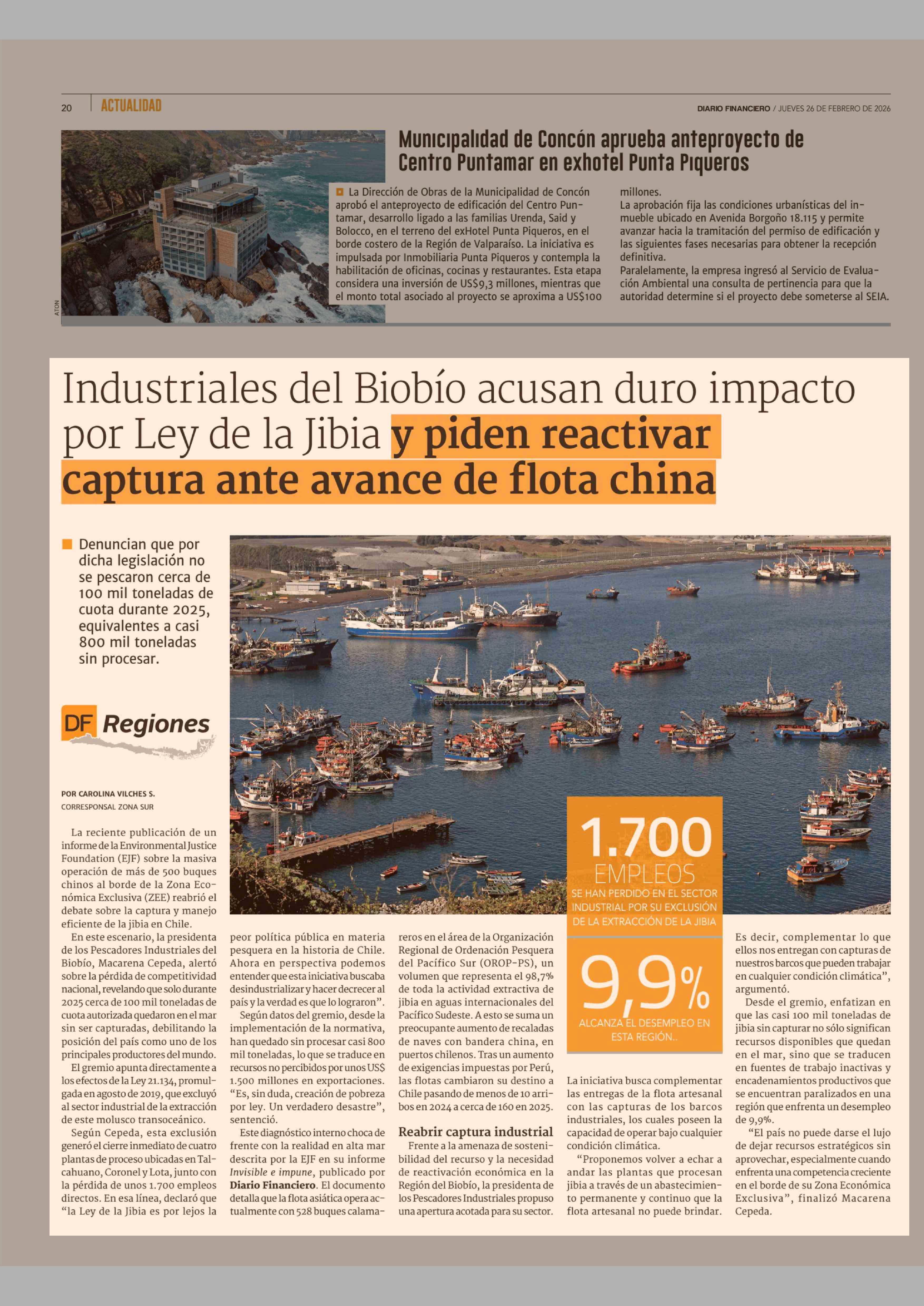 Industriales del Biobío acusan duro impacto por Ley de la Jibia y piden reactivar captura ante avance de flota china 26-02-2026 Diario Financiero |