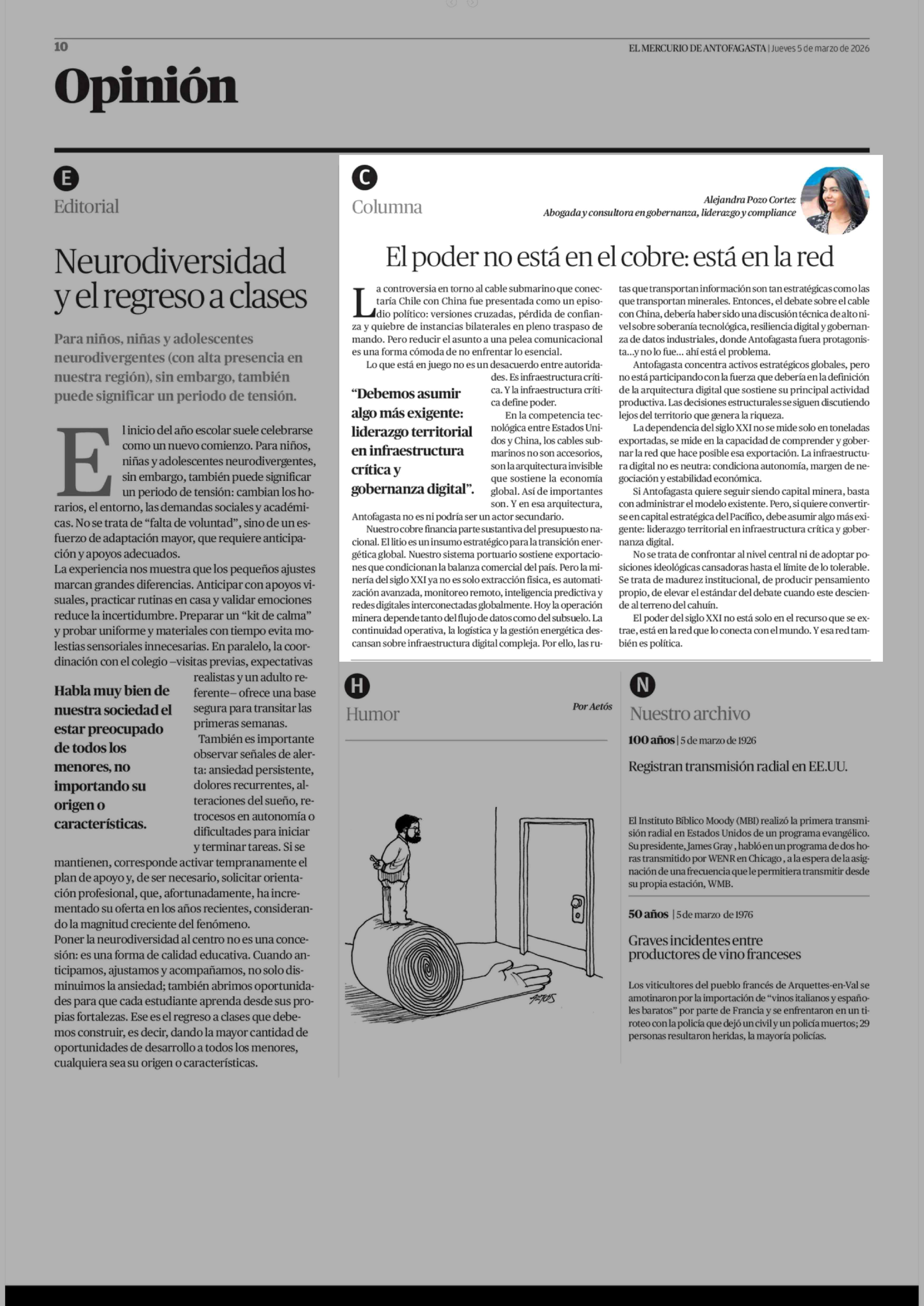 Columnas de Opinión: El poder no está en el cobre: está en la red 05-03-2026 El Mercurio de Antofagasta |