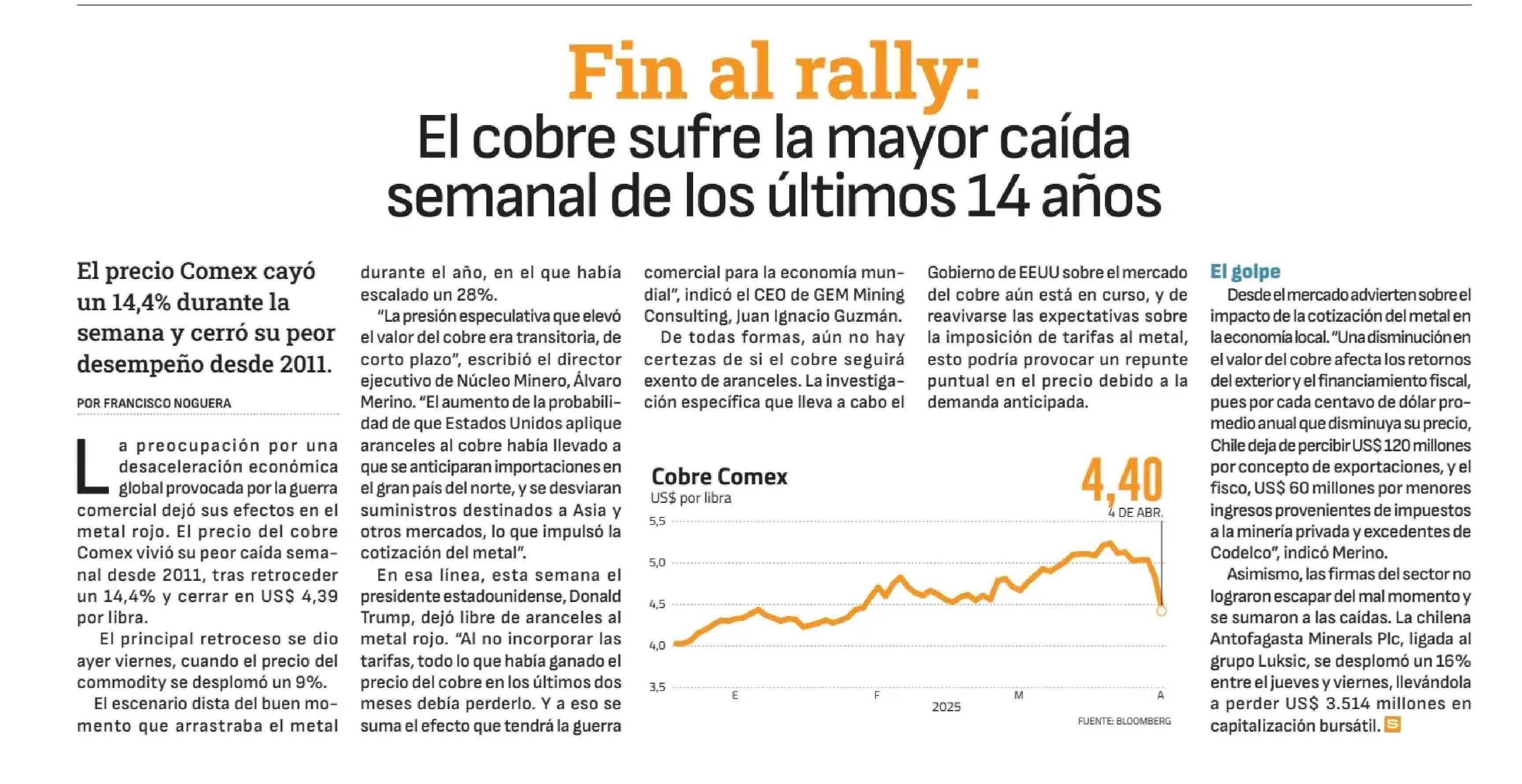 Fin al rally: El cobre sufre la mayor caída semanal de los últimos 14 años 05-04-2025 Diario Financiero |
