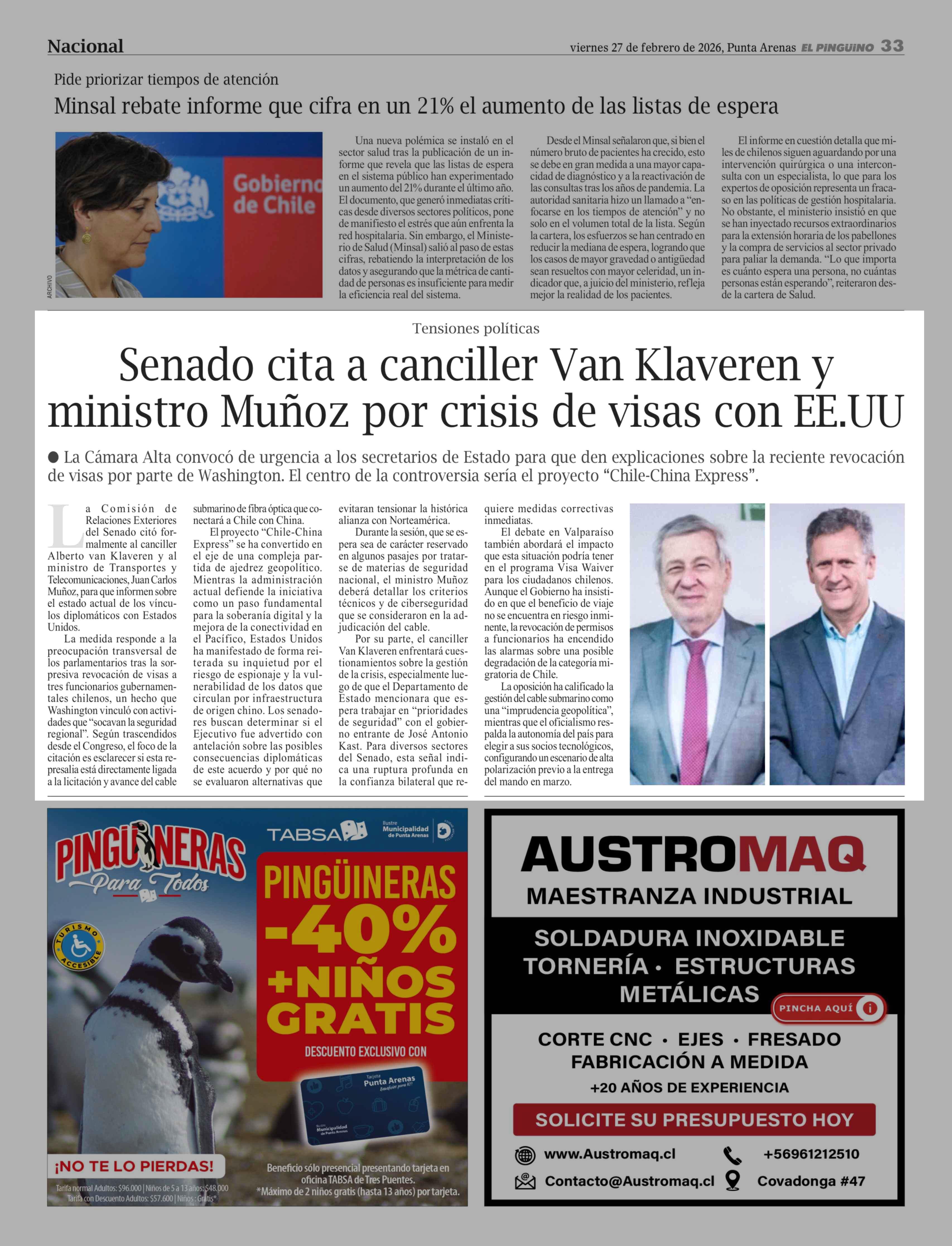 Senado cita a canciller Van Klaveren y ministro Muñoz por crisis de visas con EE.UU 27-02-2026 El Pingüino |