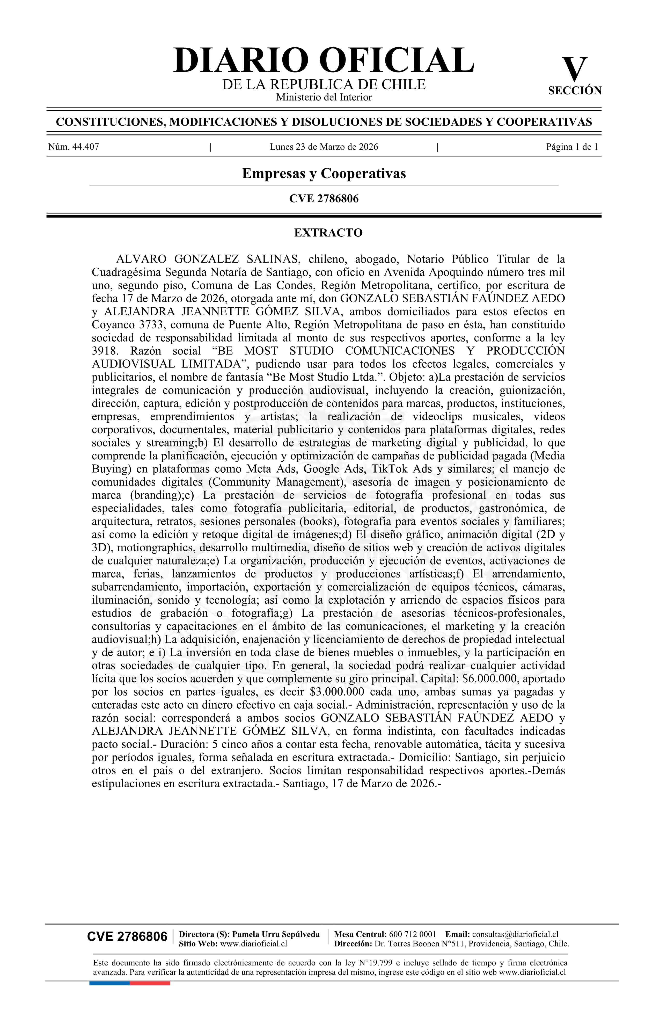 BE MOST STUDIO COMUNICACIONES Y PRODUCCIÓN AUDIOVISUAL LIMITADA 23-03-2026 Diario Oficial Edición Electrónica |