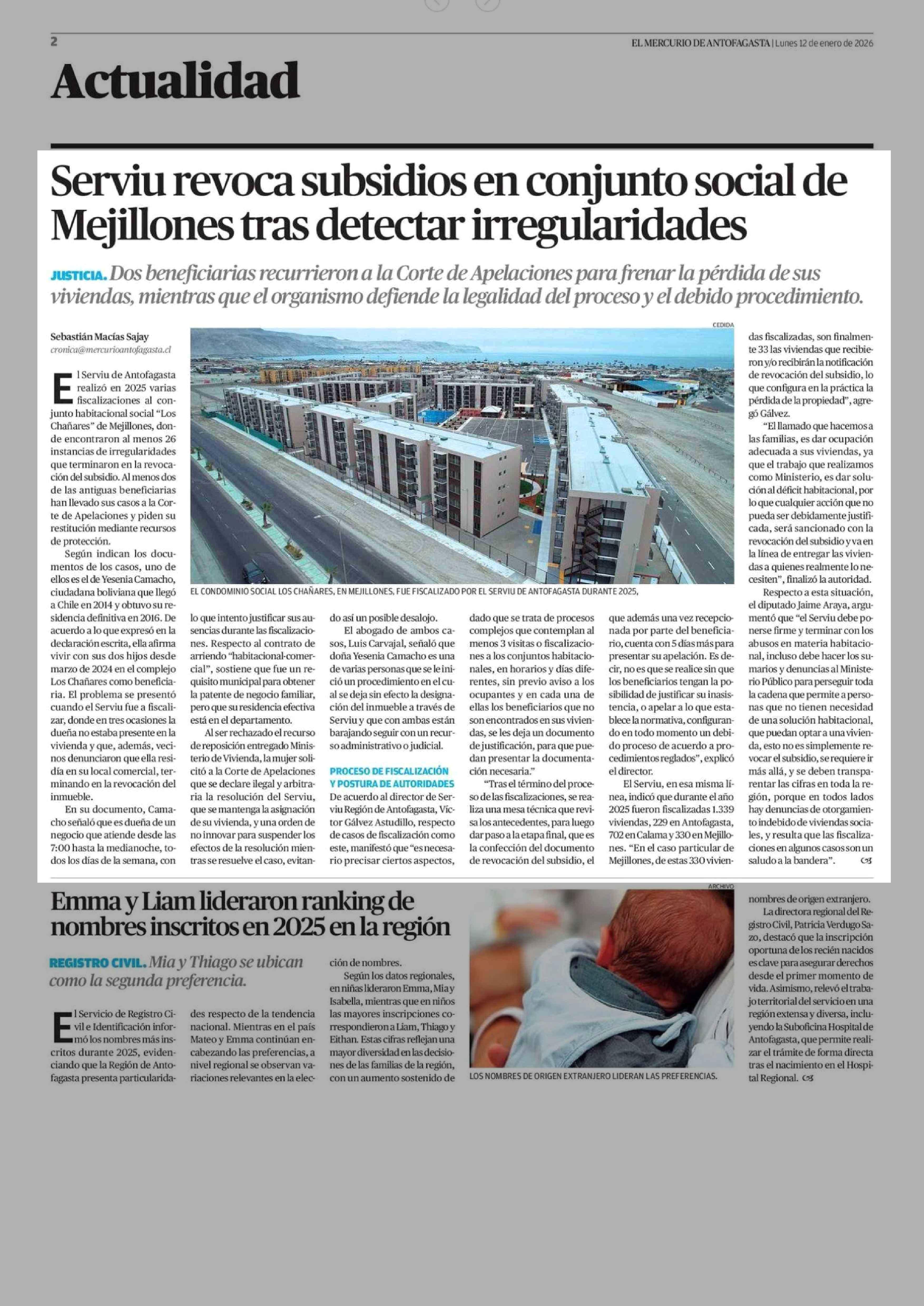 Serviu revoca subsidios en conjunto social de Mejillones tras detectar irregularidades 12-01-2026 El Mercurio de Antofagasta |