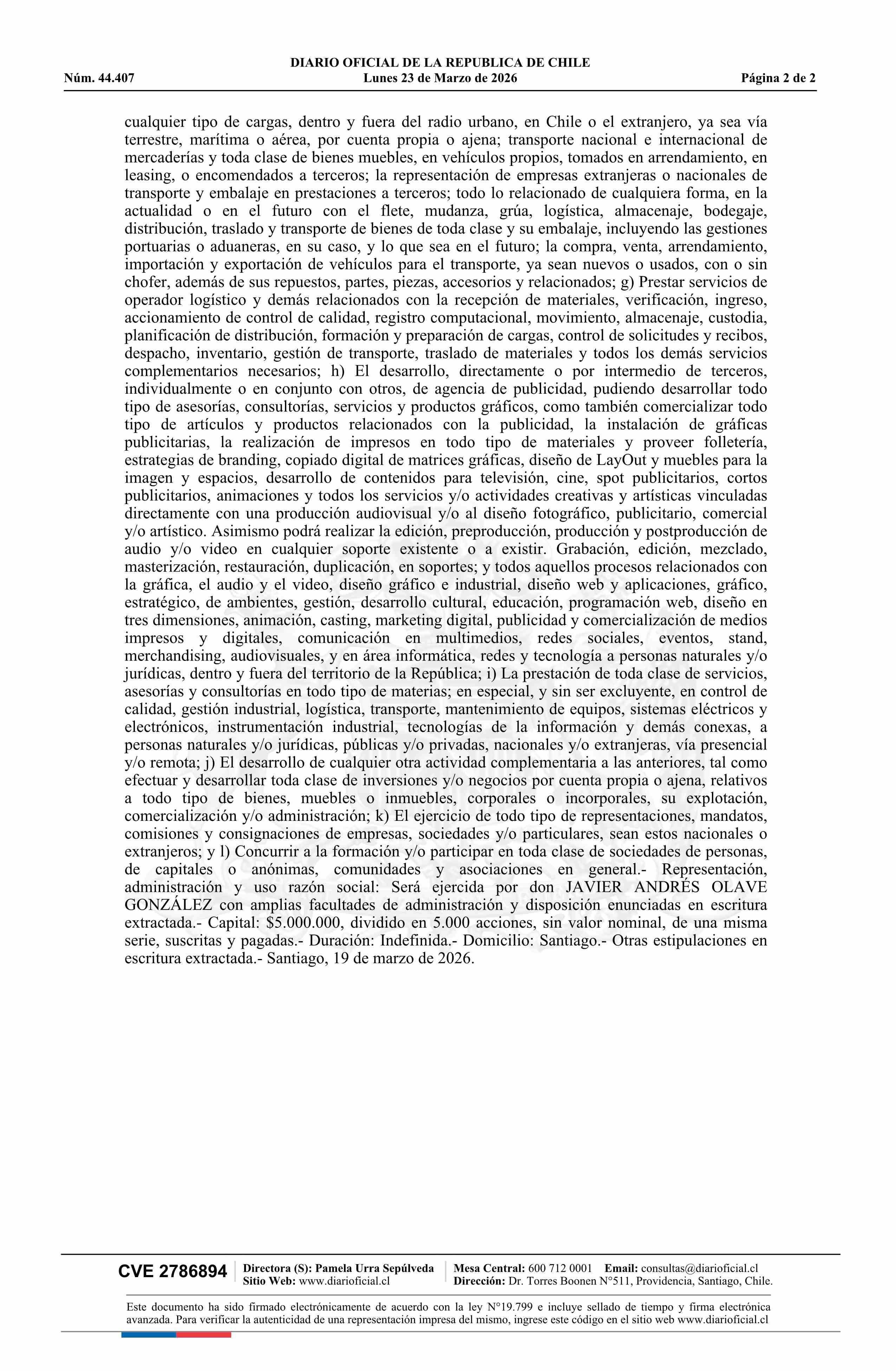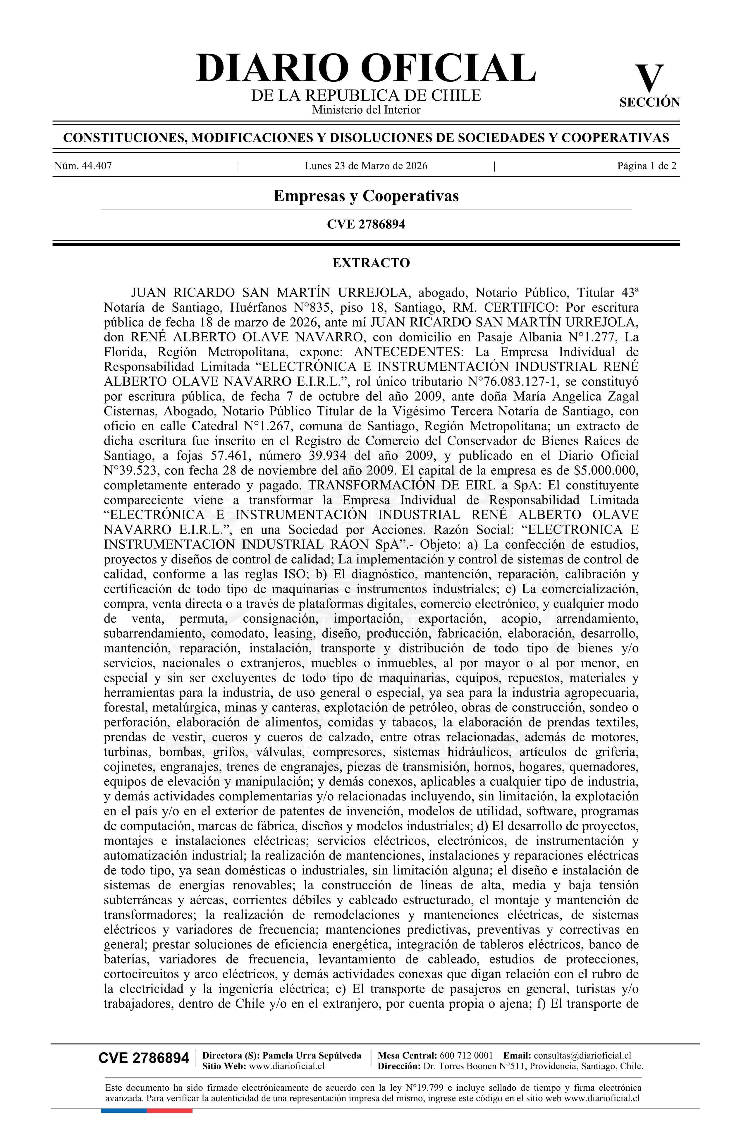 Electrónica e Instrumentación Industrial René Alberto Olave Navarro E.I.R.L. 76.083.127-1 23-03-2026 Diario Oficial Edición Electrónica |