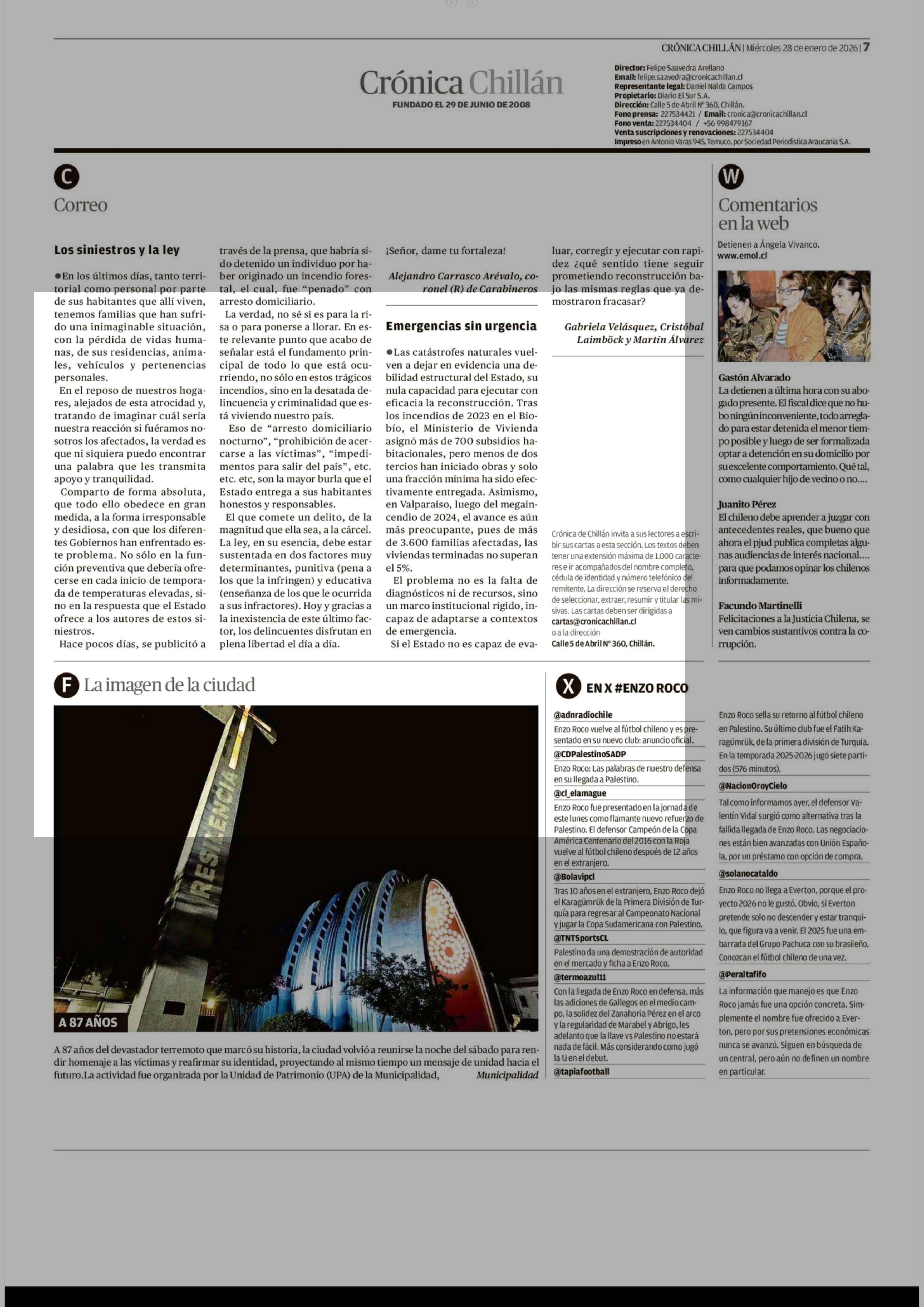 CARTAS: Los siniestros y la ley 28-01-2026 Crónica de Chillán |