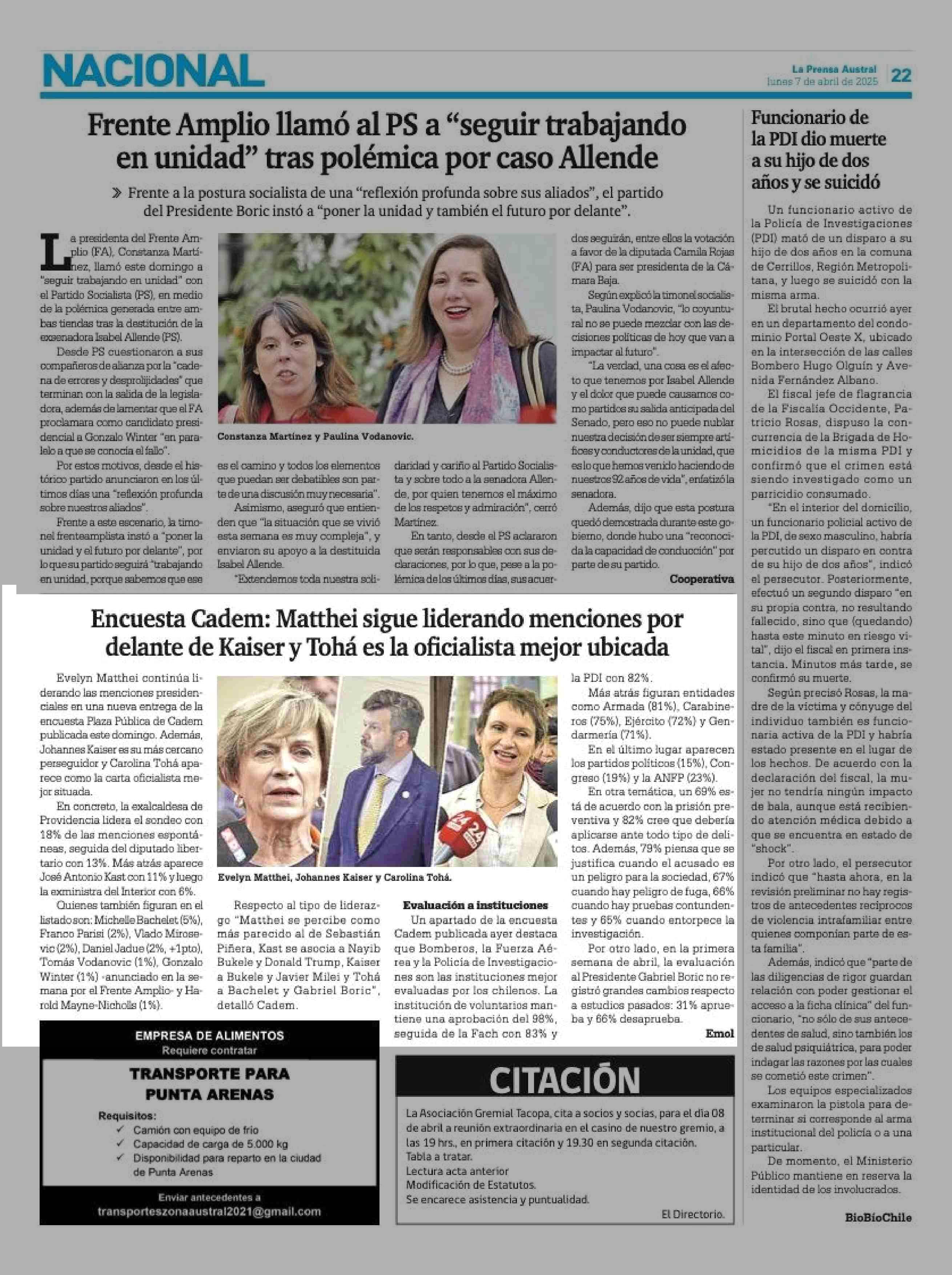 Encuesta Cadem: Matthei sigue liderando menciones por delante de Kaiser v Tohá es la oficialista mejor ubicada 07-04-2025 La Prensa Austral |