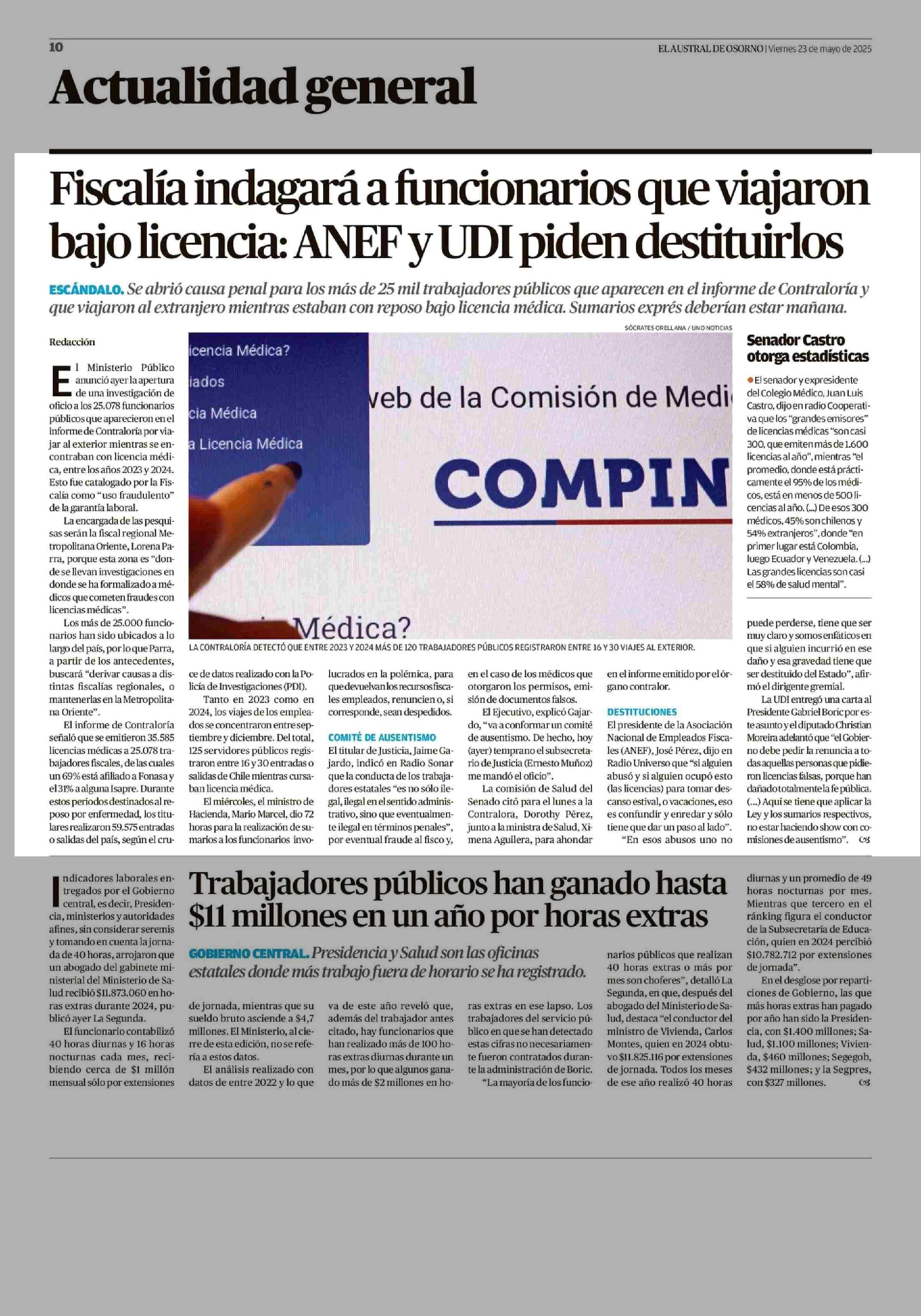 Fiscalía indagará a funcionarios que viajaron bajo licencia: ANEF y UDI piden destituirlos 23-05-2025 El Austral de Osorno |