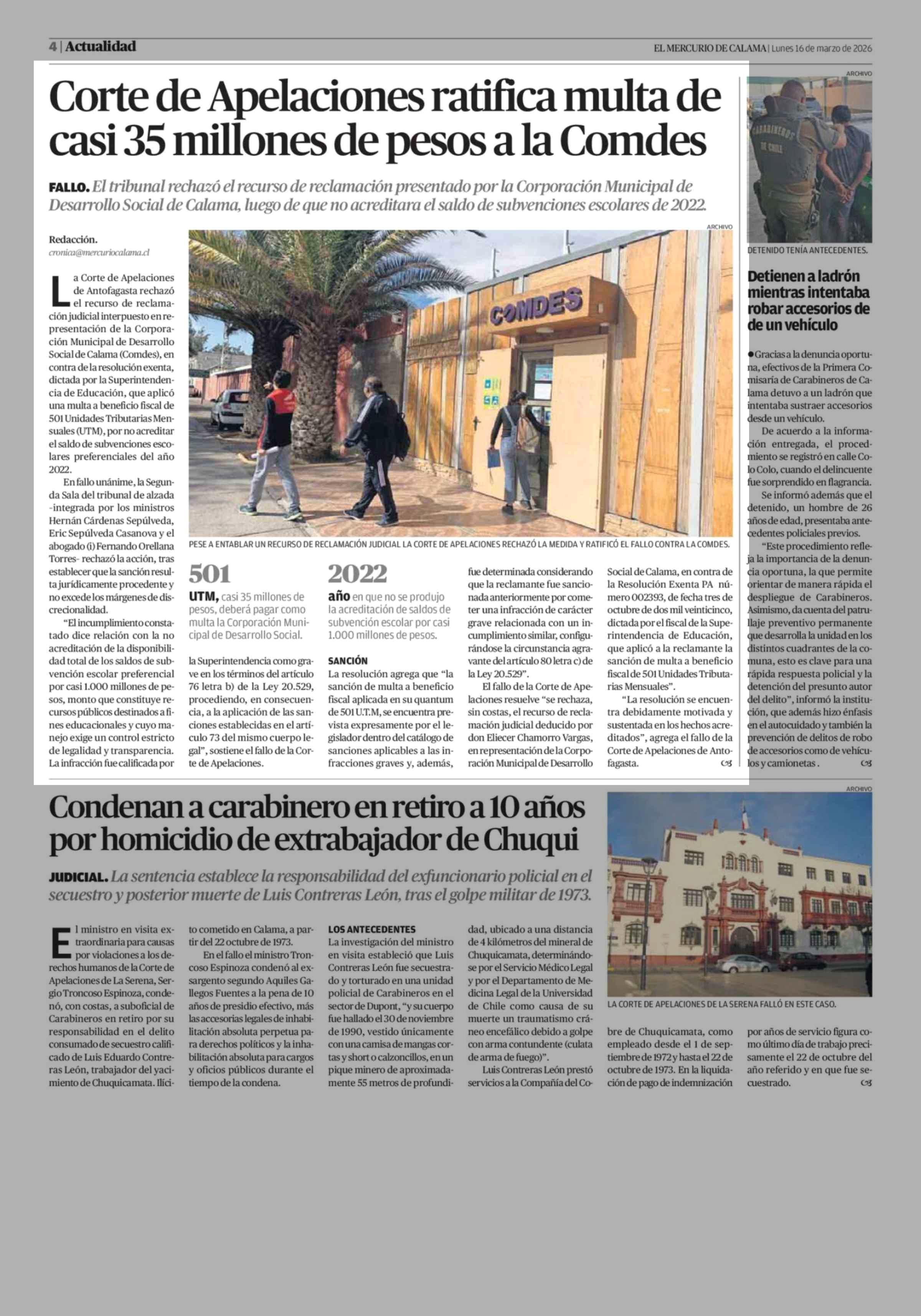 Corte de Apelaciones ratifica multa de casi 35 millones de pesos a la Comdes 16-03-2026 El Mercurio de Calama |