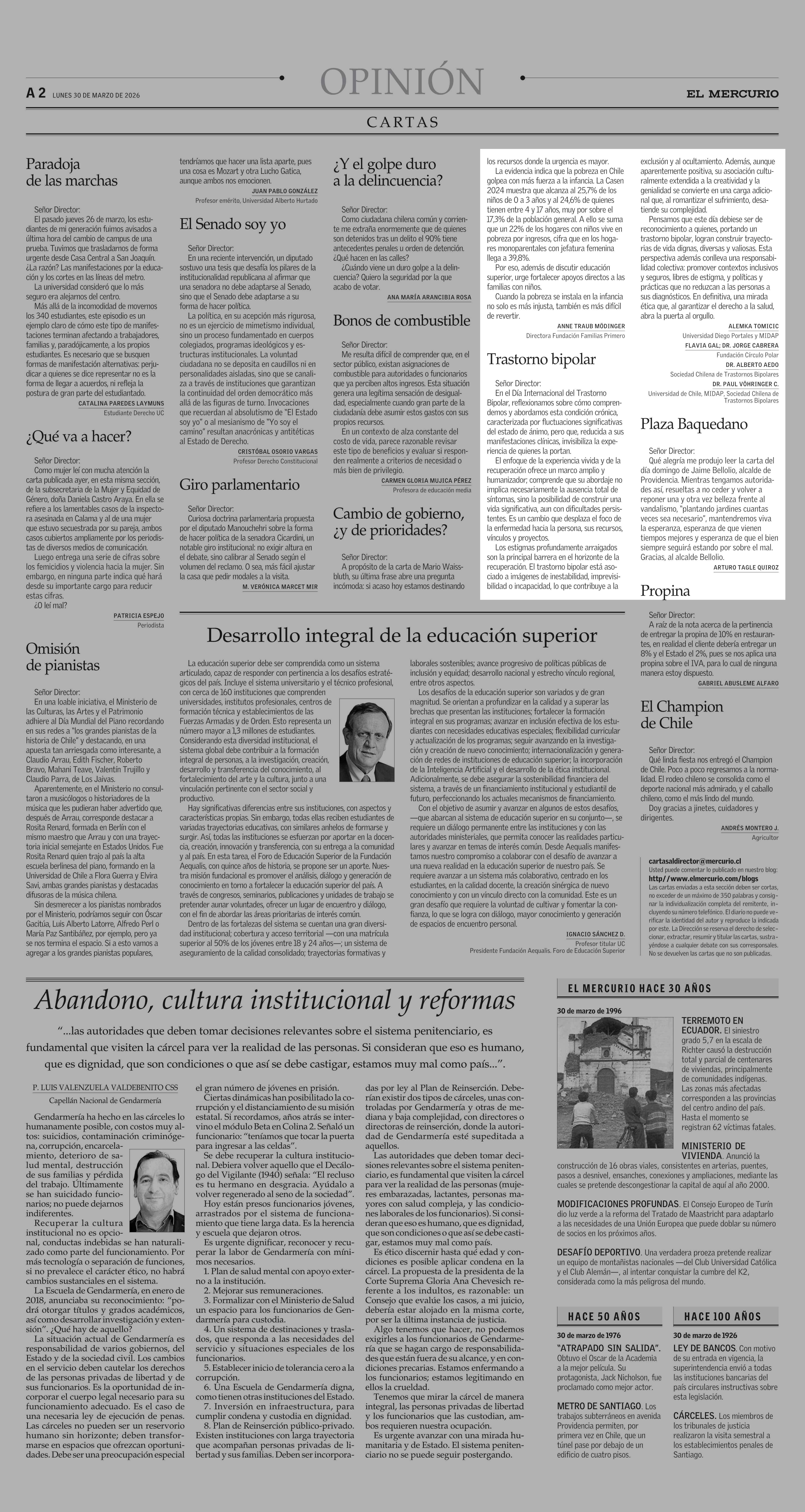 Cartas: Trastorno bipolar 30-03-2026 El Mercurio |