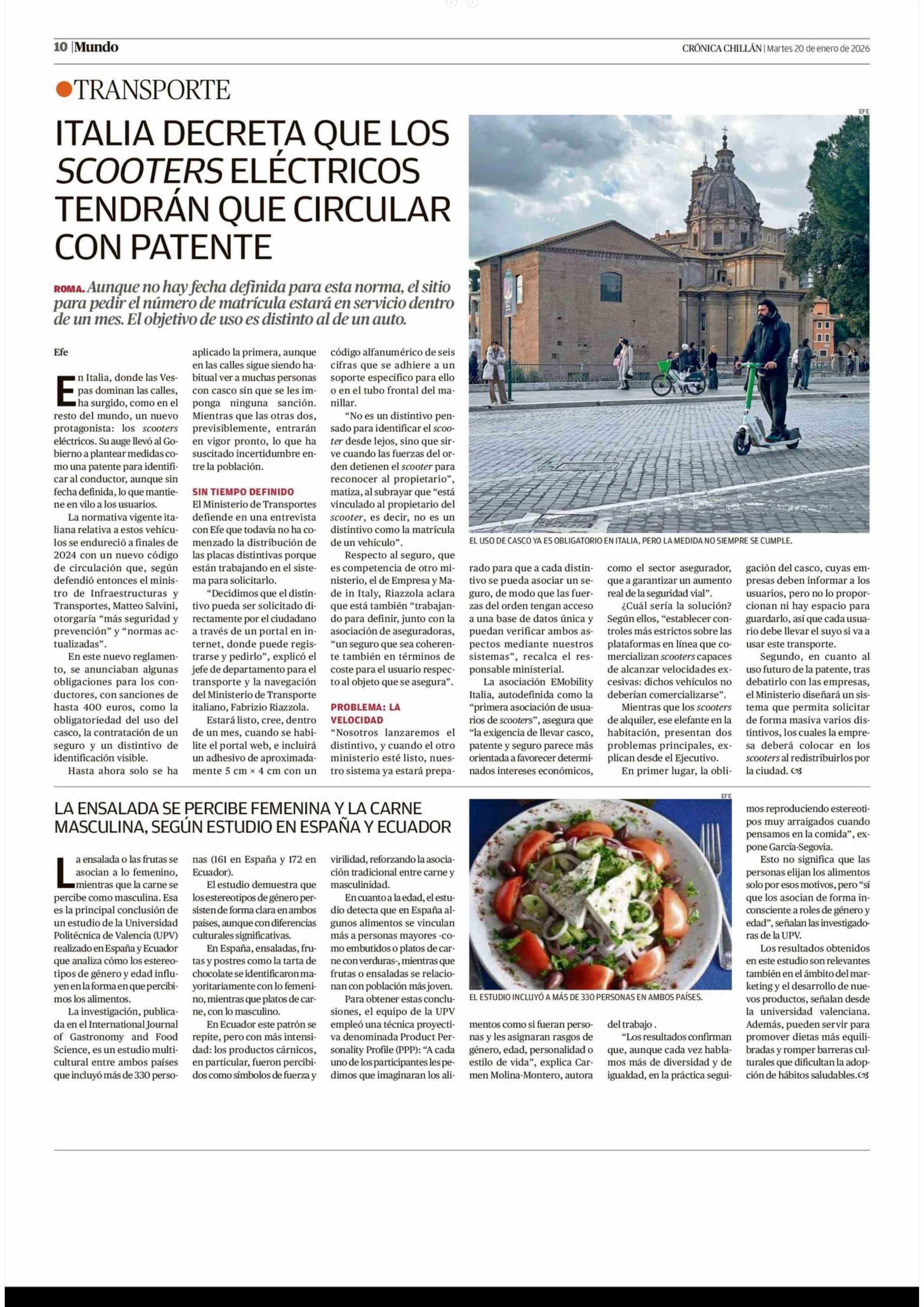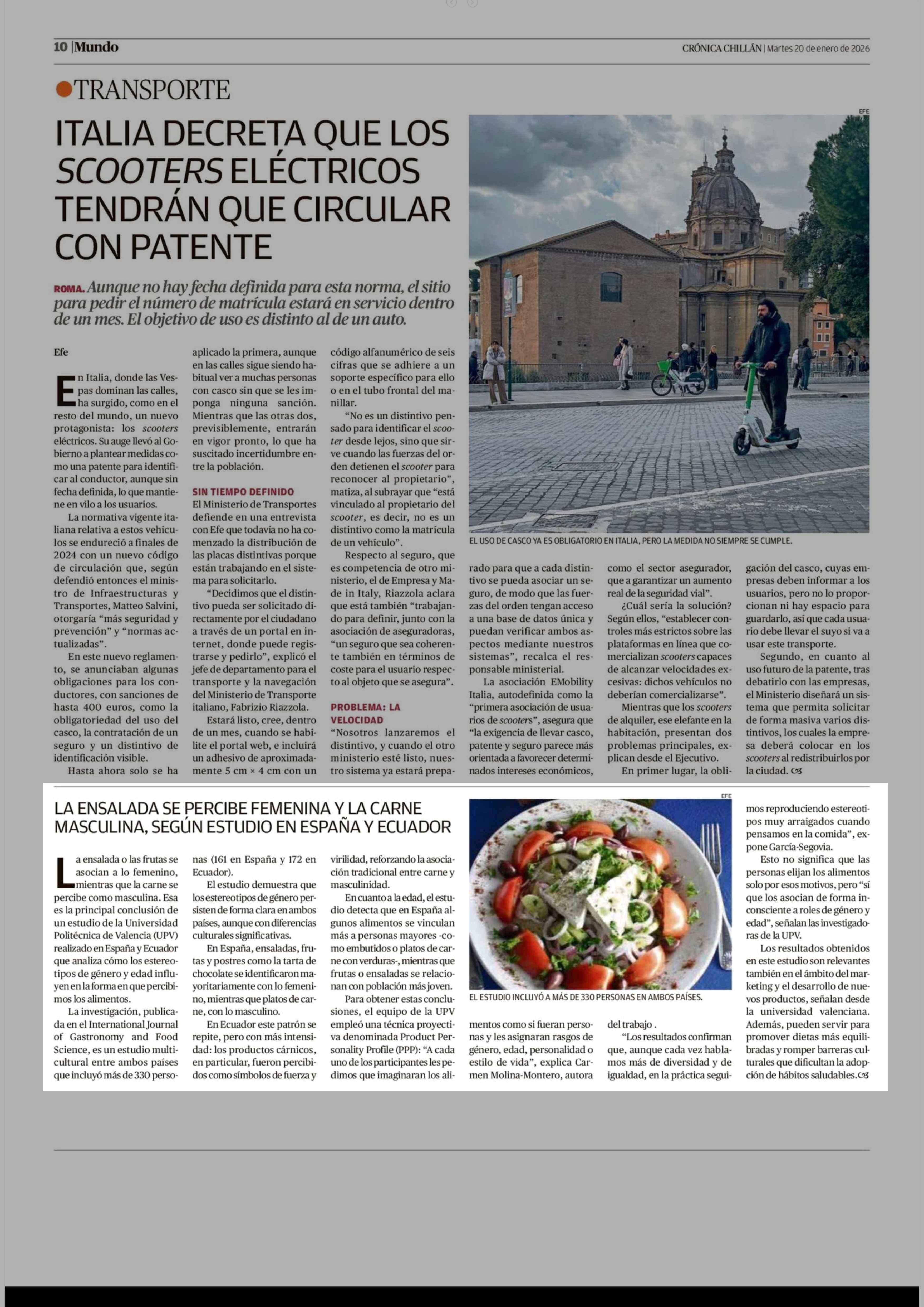 LA ENSALADA SE PERCIBE FEMENINA Y LA CARNE MASCULINA, SEGÚN ESTUDIO EN ESPAÑA Y ECUADOR 20-01-2026 Crónica de Chillán |