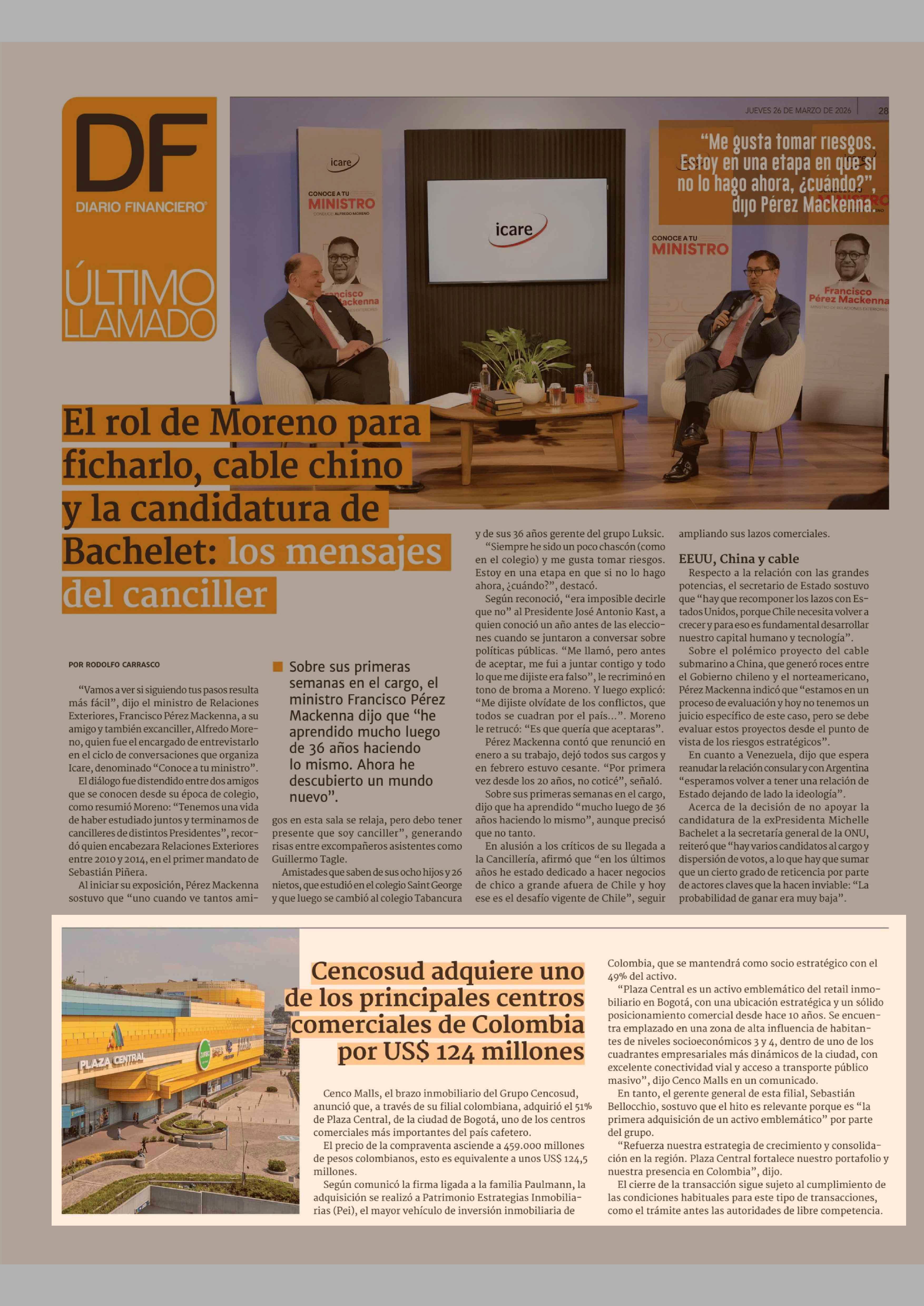 Cencosud adquiere uno de los principales centros comerciales de Colombia por US$ 124 millones 26-03-2026 Diario Financiero |