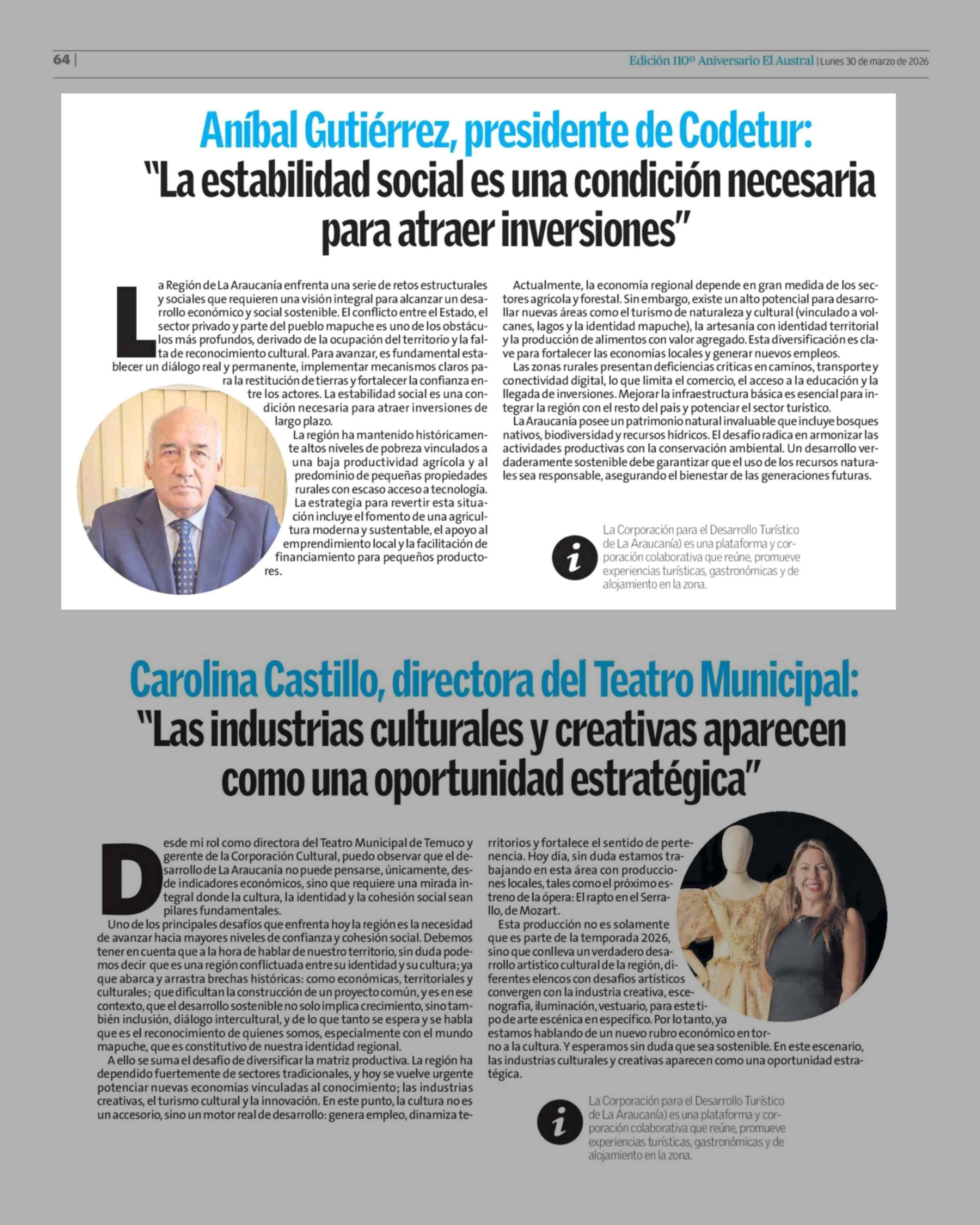 Columnas de Opinión: Aníbal Gutiérrez, presidente de Codetur: "La estabilidad social es una condición necesaria para atraer inversiones" 30-03-2026 El Austral de la Araucanía |