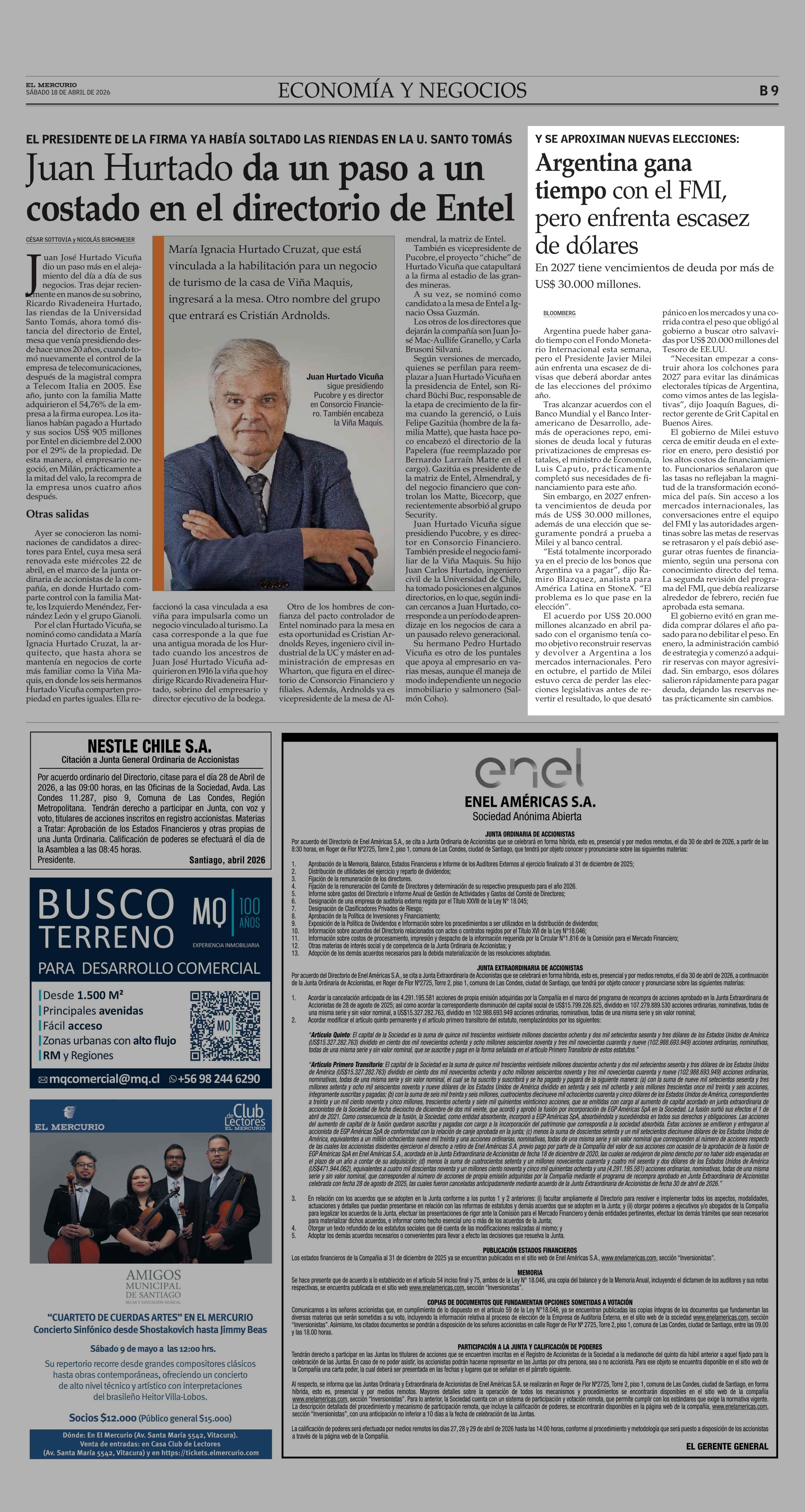 Argentina gana tiempo con el FMI, pero enfrenta escasez de dólares 18-04-2026 El Mercurio |