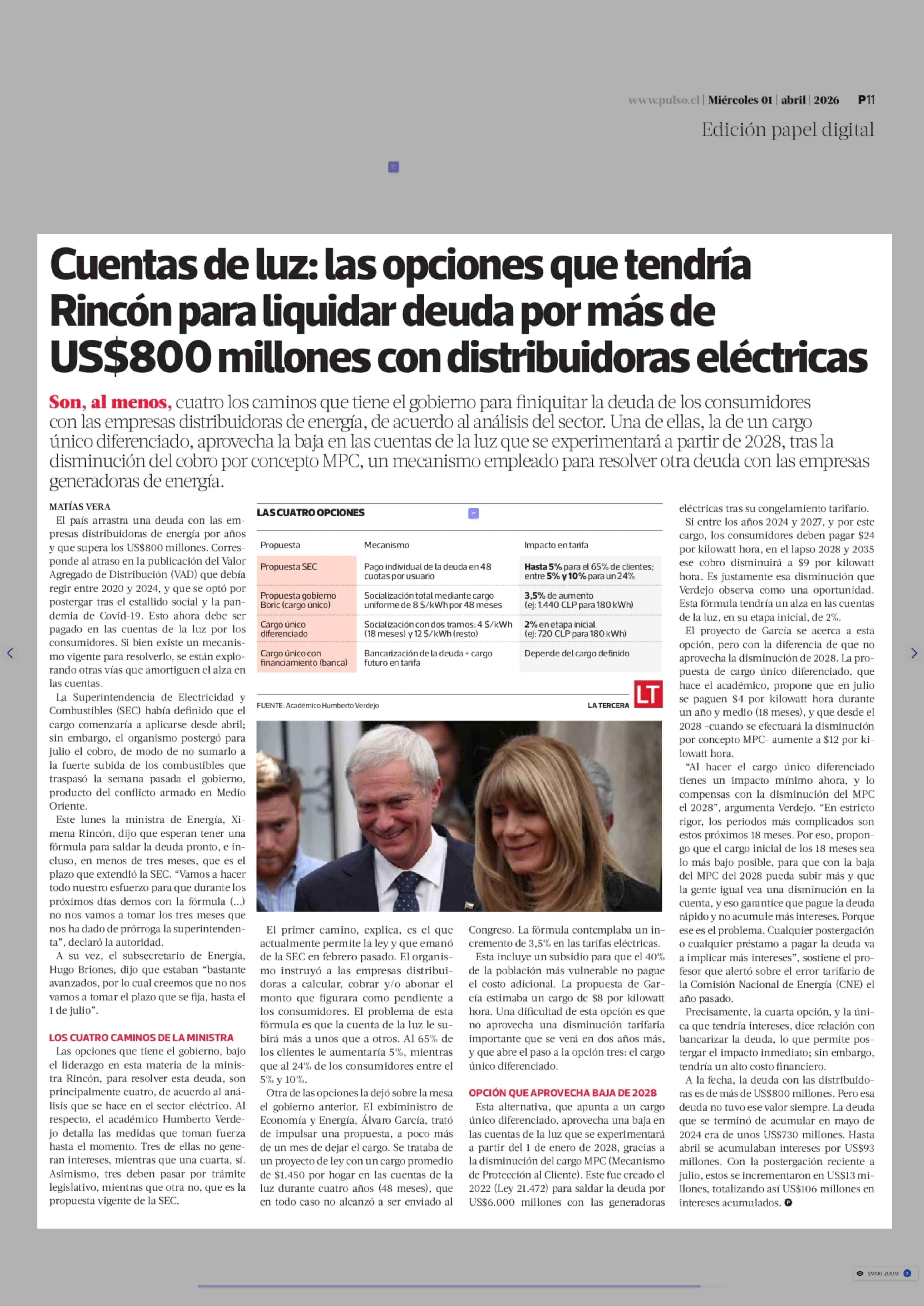 Cuentas de luz: las opciones que tendría Rincón para liquidar deuda por más de US$800 millones con distribuidoras eléctricas 01-04-2026 La Tercera |