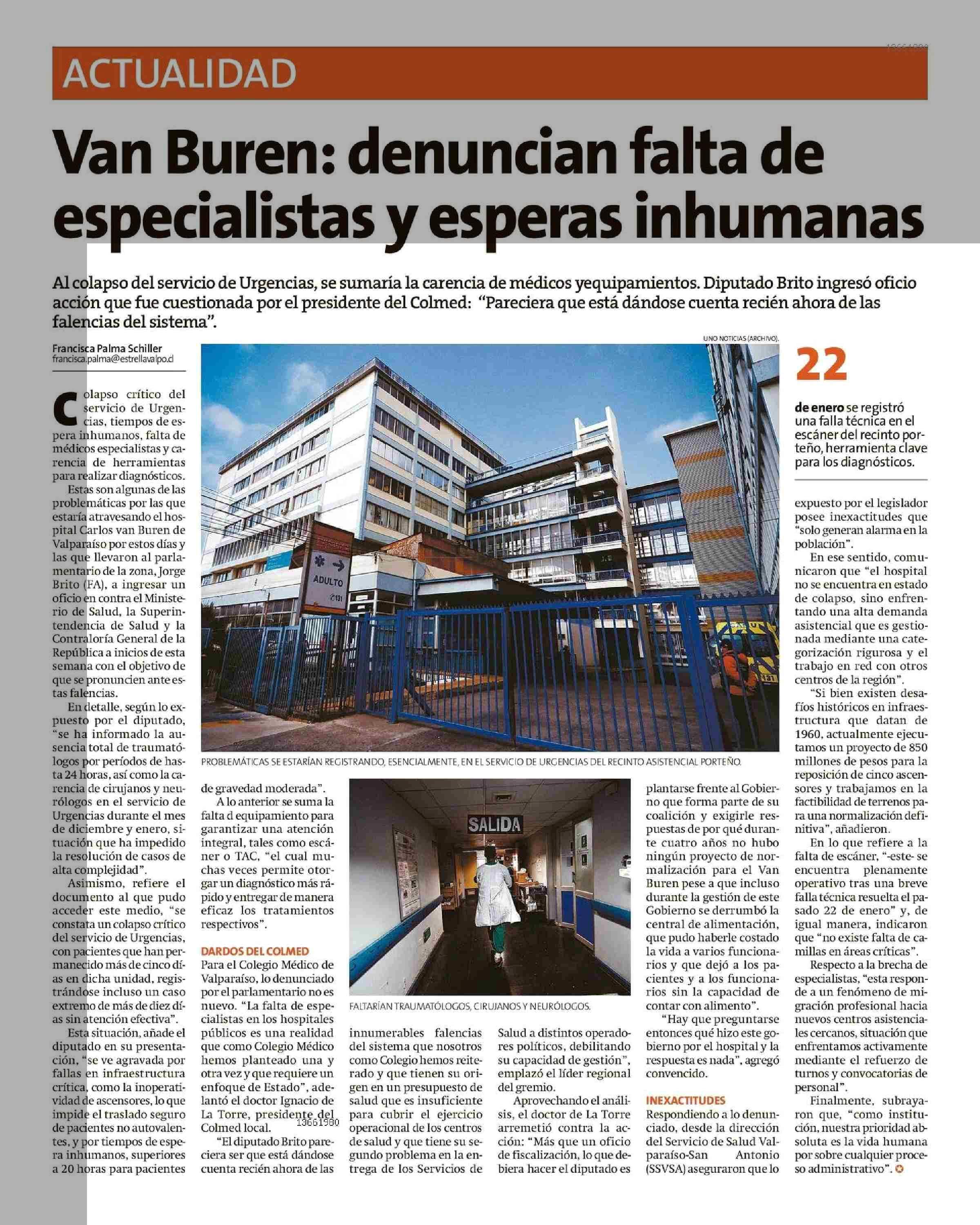 Van Buren: denuncian falta de especialistas y esperas inhumanas 28-01-2026 La Estrella de Valparaíso |