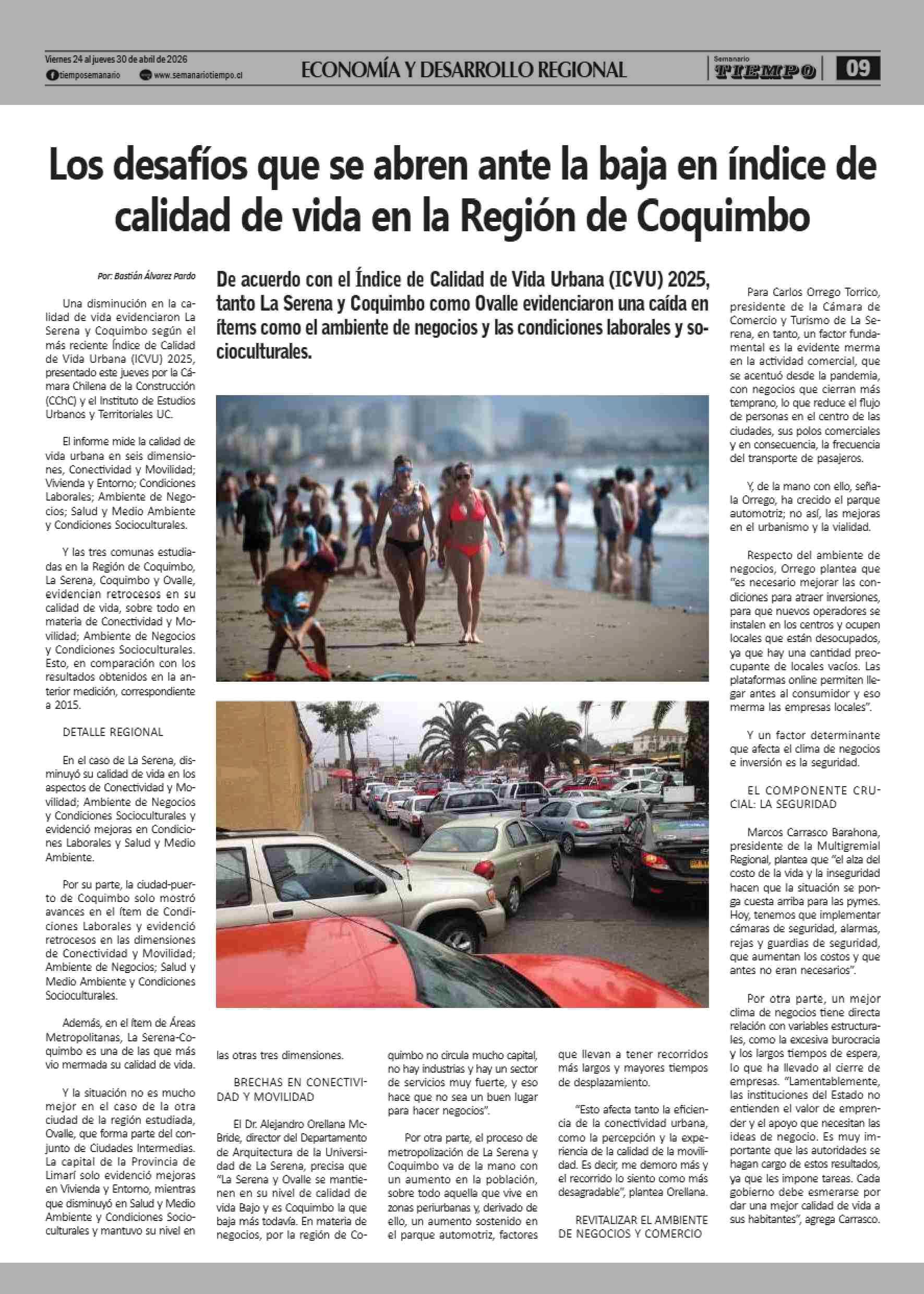 Los desafíos que se abren ante la baja en índice de calidad de vida en la Región de Coquimbo 24-04-2026 Semanario Tiempo |