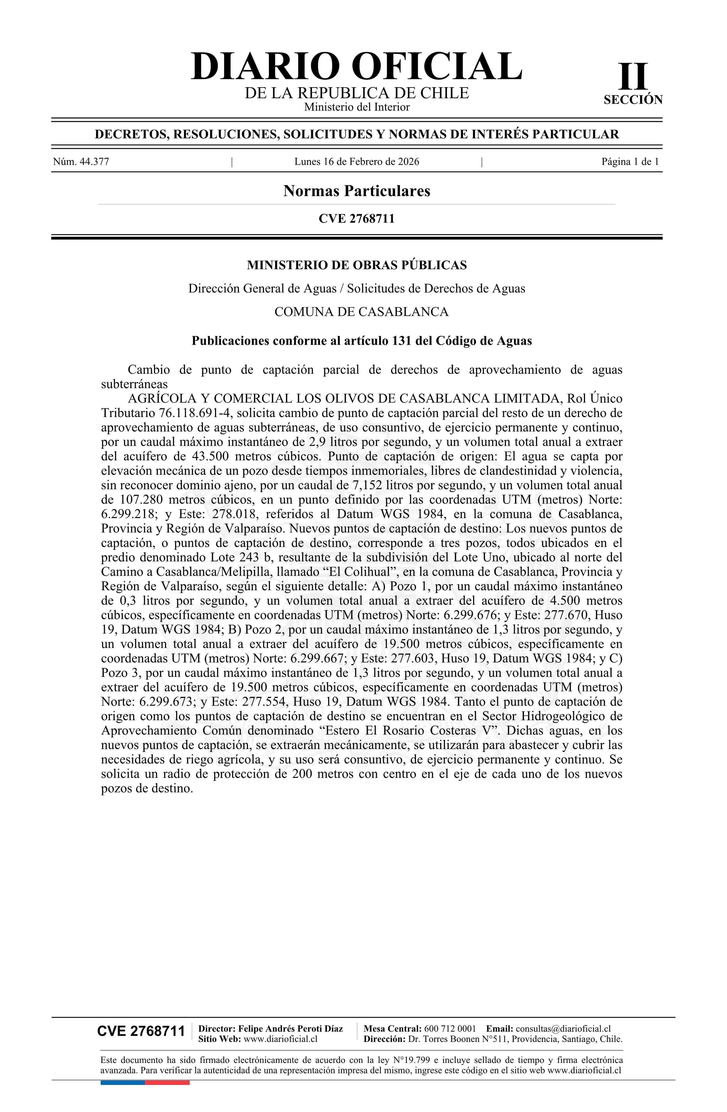 Solicitud Agrícola y Comercial Los Olivos de Casablanca Limitada