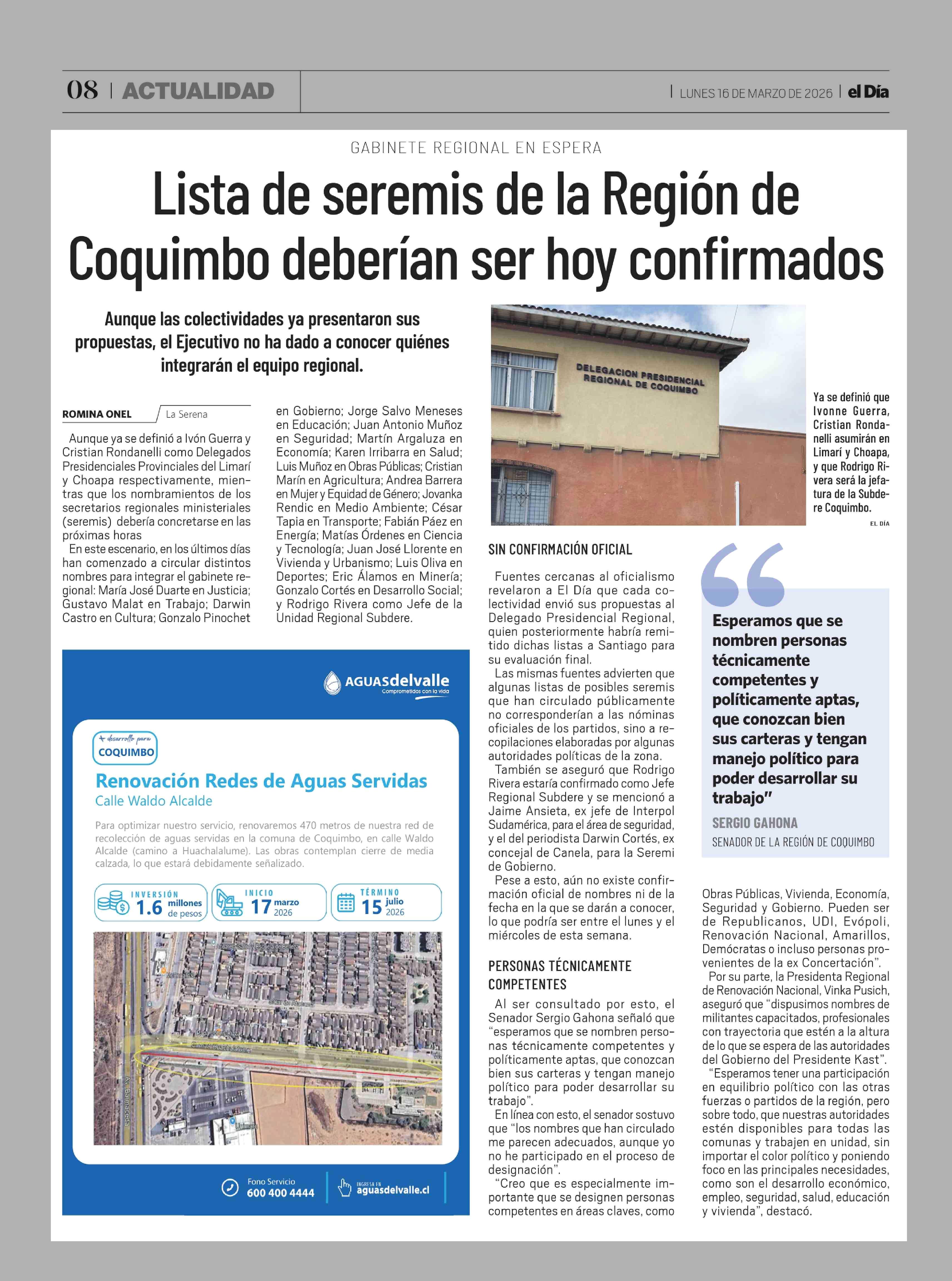 Lista de seremis de la Región de Coquimbo deberían ser hoy confirmados 16-03-2026 El Día |