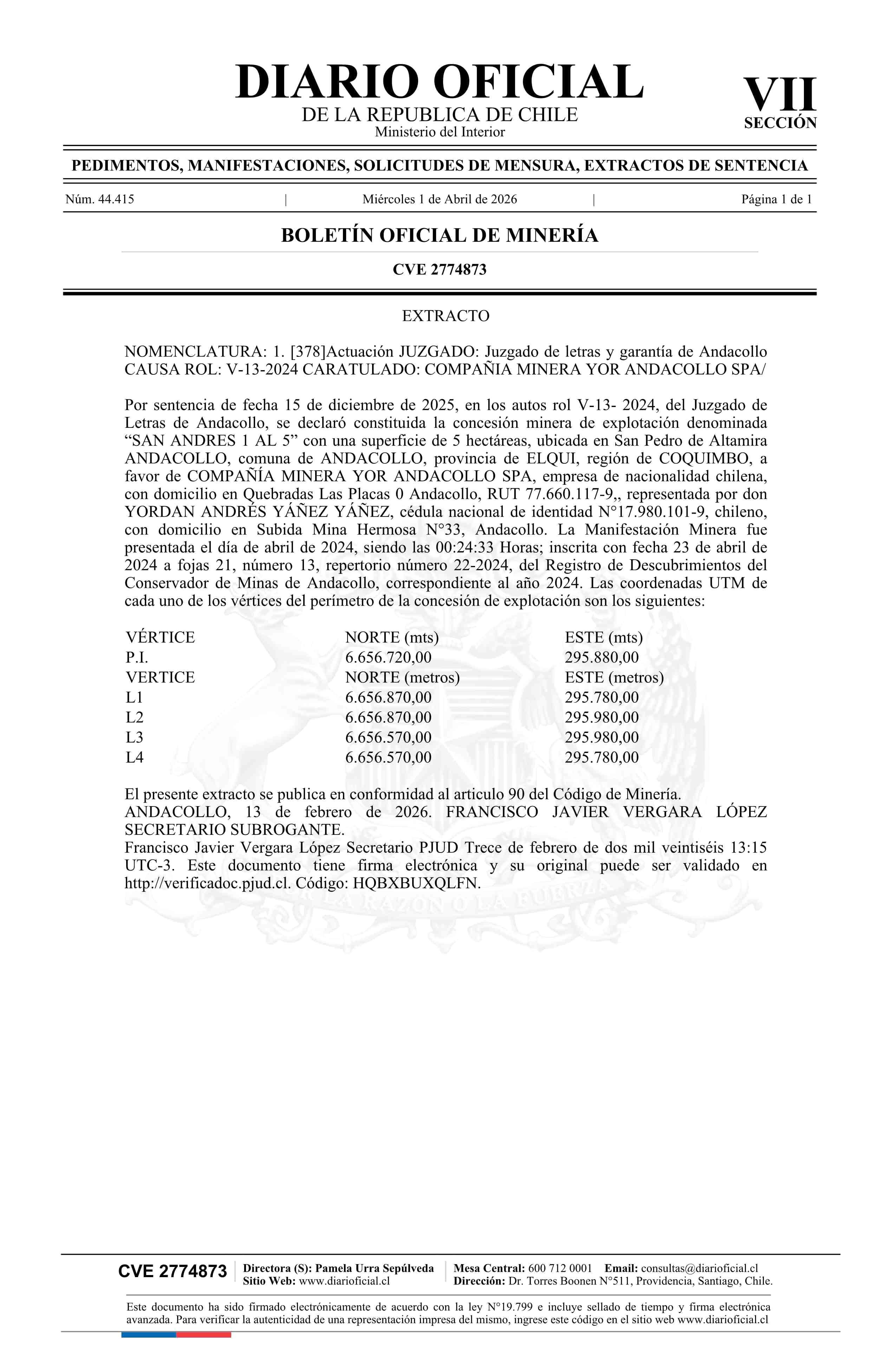SAN ANDRES 1 AL 5 / Compañía Minera Yor Andacollo SpA 01-04-2026 DIARIO OFICIAL CHILE - BOLETÍN OFICIAL DE MINERÍA |