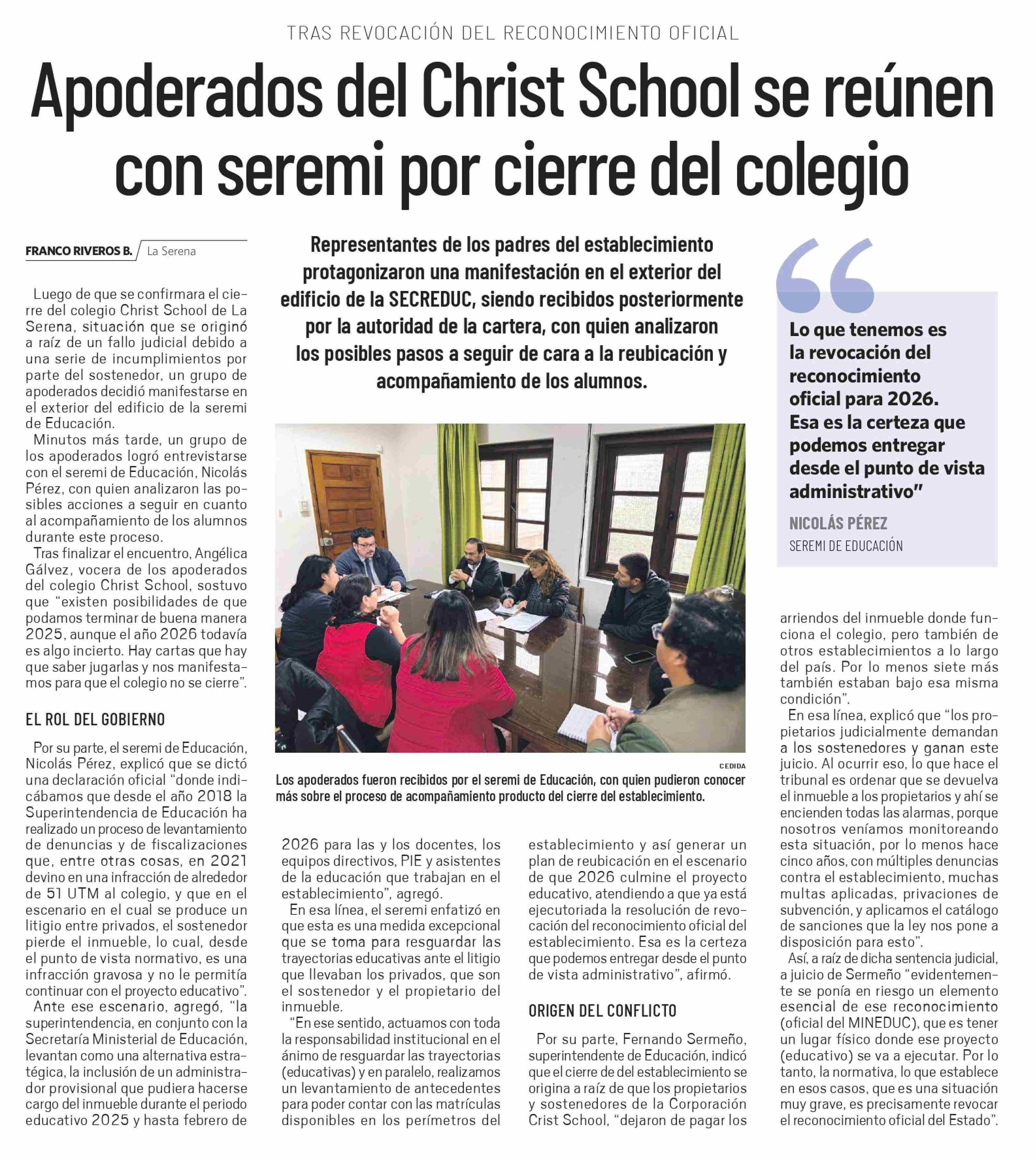 Apoderados del Christ School se reúnen con seremi por cierre del colegio 24-05-2025 El Día |