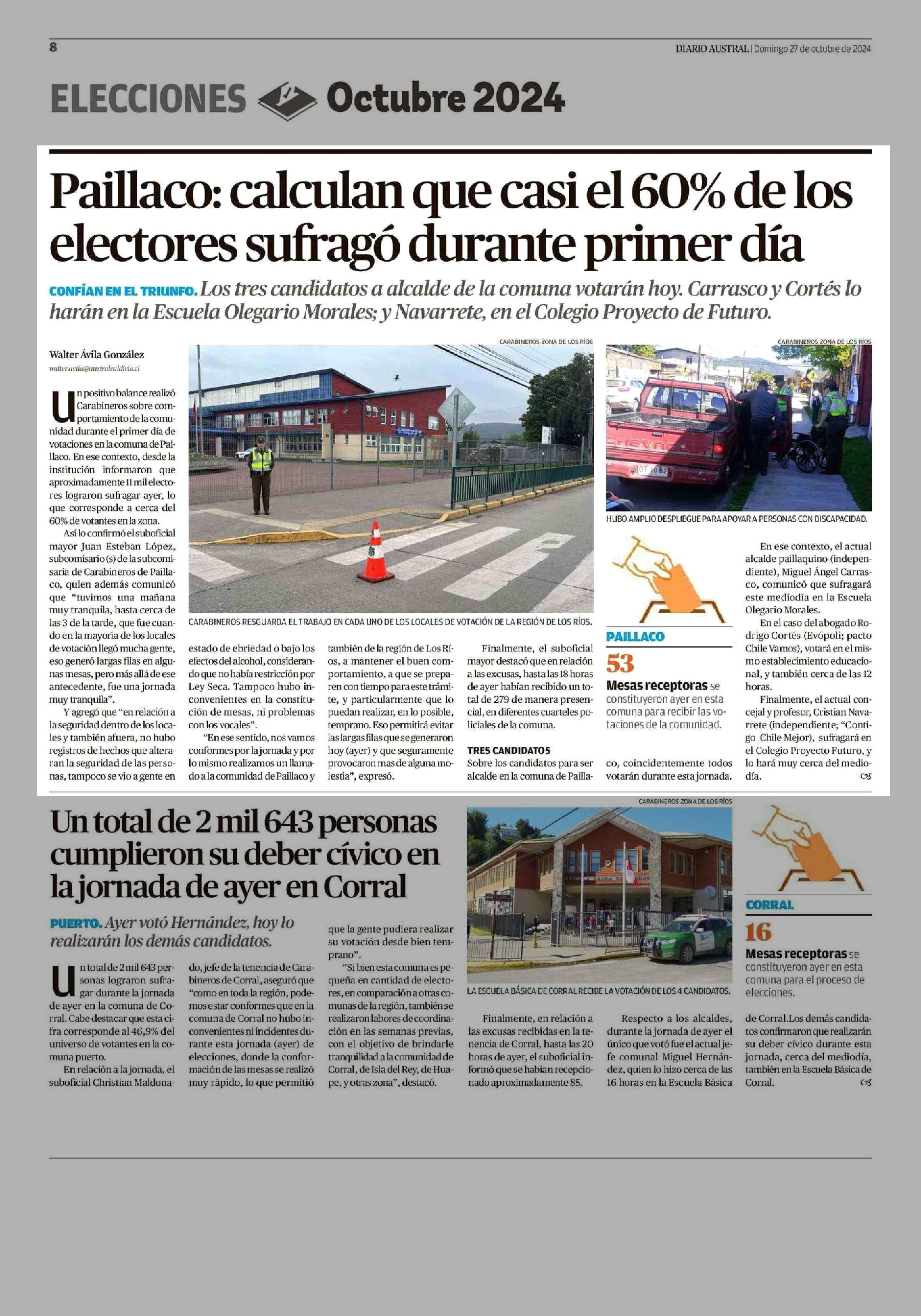 Paillaco: calculan que casi el 60% de los electores sufragó durante primer día 27-10-2024 Diario Austral Región de Los Ríos |