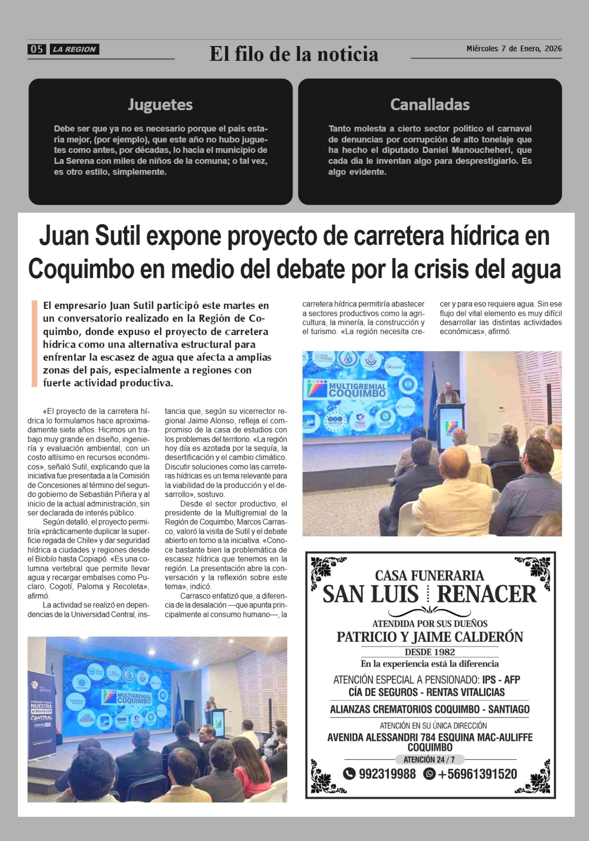 Título: Juan Sutil expone proyecto de carretera hídrica en Coquimbo en medio del debate por la crisis del agua